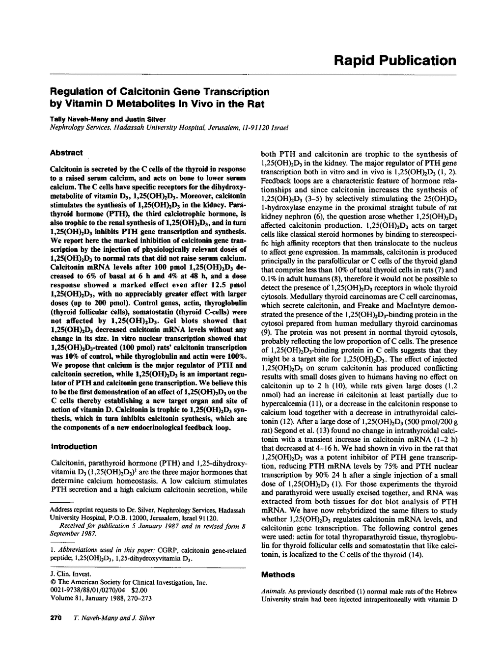 Calcitonin is secreted by the C cells of the thyroid in response to a raised serum calcium, and acts on bone to lower serum calcium. The C cells have specific receptors for the dihydroxymetabolite of vitamin D3, 1,25(OH)2D3. Moreover, calcitonin stimulates the synthesis of 1,25(OH)2D3 in the kidney. Parathyroid hormone (PTH), the third calciotrophic hormone, is also trophic to the renal synthesis of 1,25(OH)2D3, and in turn 1,25(OH)2D3 inhibits PTH gene transcription and synthesis. We report here the marked inhibition of calcitonin gene transcription by the injection of physiologically relevant doses of 1,25(OH)2D3 to normal rats that did not raise serum calcium. Calcitonin mRNA levels after 100 pmol 1,25(OH)2D3 decreased to 6% of basal at 6 h and 4% at 48 h, and a dose response showed a marked effect even after 12.5 pmol 1,25(OH)2D3, with no appreciably greater effect with larger doses (up to 200 pmol). Control genes, actin, thyroglobulin (thyroid follicular cells), somatostatin (thyroid C-cells) were not affected by 1,25(OH)2D3. Gel blots showed that 1,25(OH)2D3 decreased calcitonin mRNA levels without any change in its size. In vitro nuclear transcription showed that 1,25(OH)2D3-treated (100 pmol) rats' calcitonin transcription was 10% of control, while thyroglobulin and actin were 100%. We propose that calcium is the major regulator of PTH and calcitonin secretion, while 1,25(OH)2D3 is an important regulator of PTH and calcitonin gene transcription. We believe this to be the first demonstration of an effect of 1,25(OH)2D3 on the C cells thereby establishing a new target organ and site of action of vitamin D. Calcitonin is trophic to 1,25(OH)2D3 synthesis, which in turn inhibits calcitonin synthesis, which are the components of a new endocrinological feedback loop.