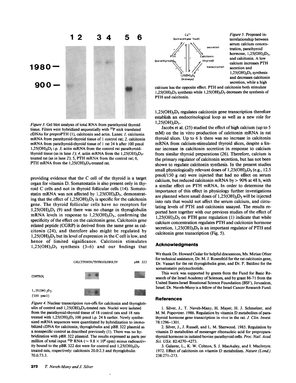 Calcitonin is secreted by the C cells of the thyroid in response to a raised serum calcium, and acts on bone to lower serum calcium. The C cells have specific receptors for the dihydroxymetabolite of vitamin D3, 1,25(OH)2D3. Moreover, calcitonin stimulates the synthesis of 1,25(OH)2D3 in the kidney. Parathyroid hormone (PTH), the third calciotrophic hormone, is also trophic to the renal synthesis of 1,25(OH)2D3, and in turn 1,25(OH)2D3 inhibits PTH gene transcription and synthesis. We report here the marked inhibition of calcitonin gene transcription by the injection of physiologically relevant doses of 1,25(OH)2D3 to normal rats that did not raise serum calcium. Calcitonin mRNA levels after 100 pmol 1,25(OH)2D3 decreased to 6% of basal at 6 h and 4% at 48 h, and a dose response showed a marked effect even after 12.5 pmol 1,25(OH)2D3, with no appreciably greater effect with larger doses (up to 200 pmol). Control genes, actin, thyroglobulin (thyroid follicular cells), somatostatin (thyroid C-cells) were not affected by 1,25(OH)2D3. Gel blots showed that 1,25(OH)2D3 decreased calcitonin mRNA levels without any change in its size. In vitro nuclear transcription showed that 1,25(OH)2D3-treated (100 pmol) rats' calcitonin transcription was 10% of control, while thyroglobulin and actin were 100%. We propose that calcium is the major regulator of PTH and calcitonin secretion, while 1,25(OH)2D3 is an important regulator of PTH and calcitonin gene transcription. We believe this to be the first demonstration of an effect of 1,25(OH)2D3 on the C cells thereby establishing a new target organ and site of action of vitamin D. Calcitonin is trophic to 1,25(OH)2D3 synthesis, which in turn inhibits calcitonin synthesis, which are the components of a new endocrinological feedback loop.