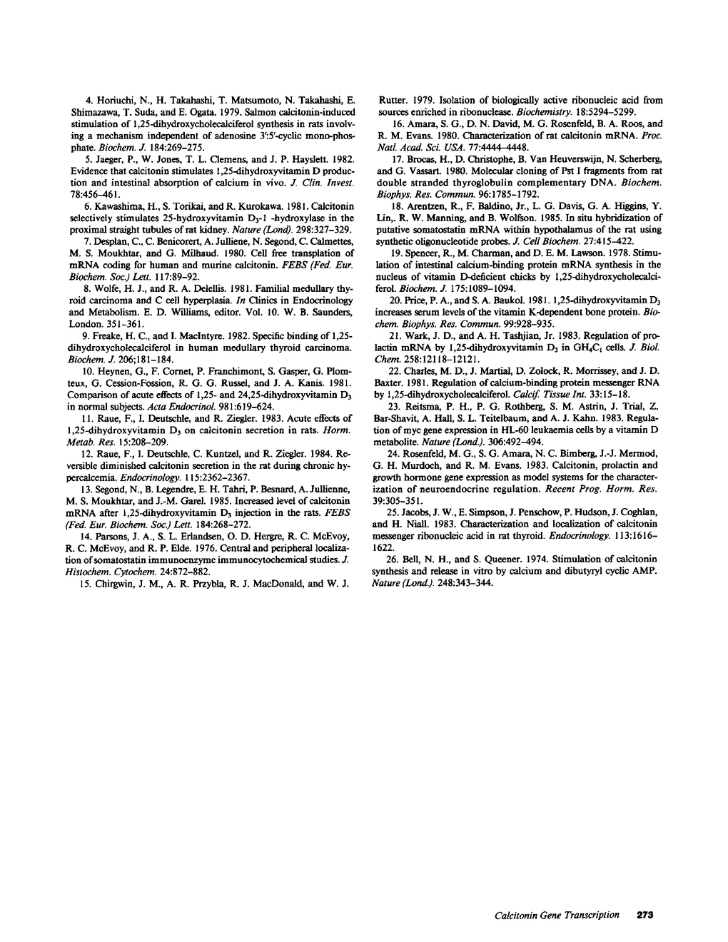 Calcitonin is secreted by the C cells of the thyroid in response to a raised serum calcium, and acts on bone to lower serum calcium. The C cells have specific receptors for the dihydroxymetabolite of vitamin D3, 1,25(OH)2D3. Moreover, calcitonin stimulates the synthesis of 1,25(OH)2D3 in the kidney. Parathyroid hormone (PTH), the third calciotrophic hormone, is also trophic to the renal synthesis of 1,25(OH)2D3, and in turn 1,25(OH)2D3 inhibits PTH gene transcription and synthesis. We report here the marked inhibition of calcitonin gene transcription by the injection of physiologically relevant doses of 1,25(OH)2D3 to normal rats that did not raise serum calcium. Calcitonin mRNA levels after 100 pmol 1,25(OH)2D3 decreased to 6% of basal at 6 h and 4% at 48 h, and a dose response showed a marked effect even after 12.5 pmol 1,25(OH)2D3, with no appreciably greater effect with larger doses (up to 200 pmol). Control genes, actin, thyroglobulin (thyroid follicular cells), somatostatin (thyroid C-cells) were not affected by 1,25(OH)2D3. Gel blots showed that 1,25(OH)2D3 decreased calcitonin mRNA levels without any change in its size. In vitro nuclear transcription showed that 1,25(OH)2D3-treated (100 pmol) rats' calcitonin transcription was 10% of control, while thyroglobulin and actin were 100%. We propose that calcium is the major regulator of PTH and calcitonin secretion, while 1,25(OH)2D3 is an important regulator of PTH and calcitonin gene transcription. We believe this to be the first demonstration of an effect of 1,25(OH)2D3 on the C cells thereby establishing a new target organ and site of action of vitamin D. Calcitonin is trophic to 1,25(OH)2D3 synthesis, which in turn inhibits calcitonin synthesis, which are the components of a new endocrinological feedback loop.