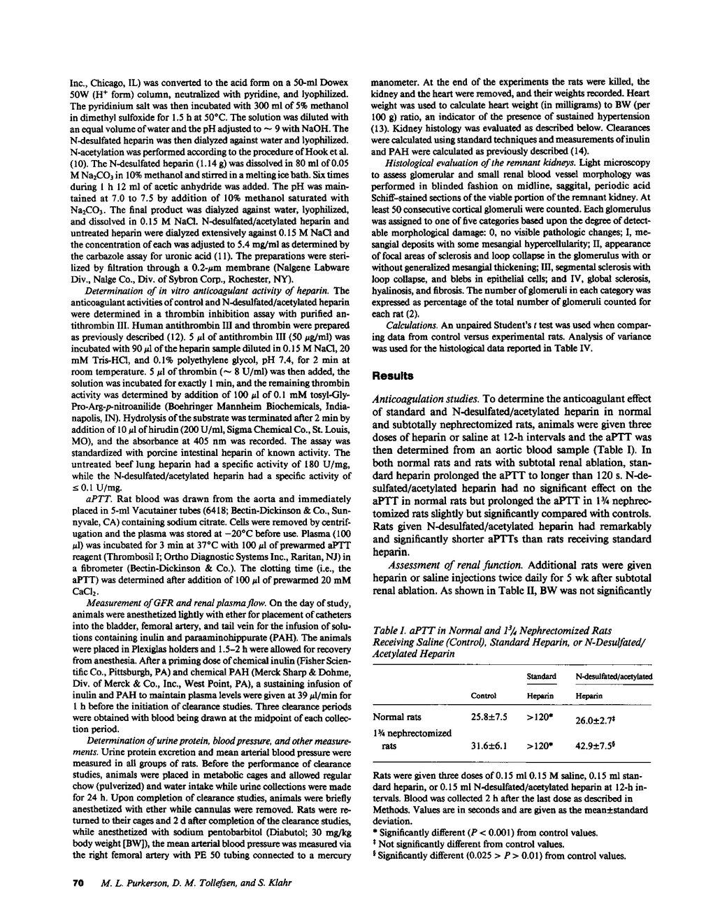 The effect of administration of N-desulfated/acetylated heparin, almost completely devoid of anticoagulant activity, on the progression of renal disease was examined in rats with 13/4 nephrectomy. Three groups of rats with 13/4 nephrectomy were studied. Group I (control, n = 11) received 0.15 ml of 0.15 M NaCl subcutaneously twice daily for 5 wk; group 2 (n = 11) received 0.15 ml twice daily of N-desulfated/acetylated heparin (5.4 mg/ml; less than 0.5 U/ml); group 3 (n = 9) received 0.15 ml twice daily of standard beef lung heparin (5.4 mg/ml; 977 U/ml). Clearances and renal histological studies were done at the end of 5 wk of heparin or saline administration. Rats given the heparin preparations had significantly higher inulin clearances (2.55 +/- 0.38 ml/min per body weight (BW) for group 2, or 2.60 +/- 0.24 ml/min per kg BW for group 3) than control rats (1.59 +/- 0.20 ml/min per kg BW). Histological analysis revealed a greater number of glomeruli with segmental or global sclerosis, hyalinosis, or fibrosis (36.6%) in control rats than in rats receiving N-desulfated/acetylated heparin (6.2%) or standard heparin (3.0%). Blood pressure averaged 169.4 +/- 6.2 mmHg in controls, 119.1 +/- 6.1 in rats of group 2, and 124.3 +/- 2.5 in rats of group 3. The values for blood pressure were significantly lower in the two groups receiving heparin than in controls. These studies indicate that a heparin preparation, almost completely devoid of anticoagulant properties, affords the same degree of protection against progression of renal disease as does standard heparin in rats with subtotal renal ablation. It is suggested that other biological properties of heparin may be responsible for the effects observed.