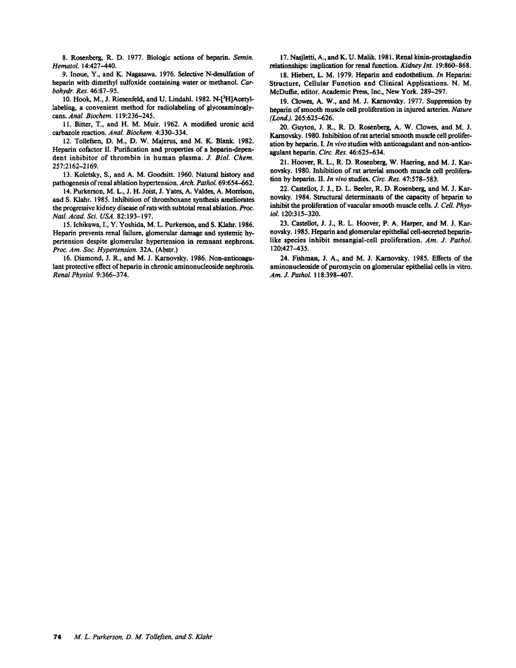 The effect of administration of N-desulfated/acetylated heparin, almost completely devoid of anticoagulant activity, on the progression of renal disease was examined in rats with 13/4 nephrectomy. Three groups of rats with 13/4 nephrectomy were studied. Group I (control, n = 11) received 0.15 ml of 0.15 M NaCl subcutaneously twice daily for 5 wk; group 2 (n = 11) received 0.15 ml twice daily of N-desulfated/acetylated heparin (5.4 mg/ml; less than 0.5 U/ml); group 3 (n = 9) received 0.15 ml twice daily of standard beef lung heparin (5.4 mg/ml; 977 U/ml). Clearances and renal histological studies were done at the end of 5 wk of heparin or saline administration. Rats given the heparin preparations had significantly higher inulin clearances (2.55 +/- 0.38 ml/min per body weight (BW) for group 2, or 2.60 +/- 0.24 ml/min per kg BW for group 3) than control rats (1.59 +/- 0.20 ml/min per kg BW). Histological analysis revealed a greater number of glomeruli with segmental or global sclerosis, hyalinosis, or fibrosis (36.6%) in control rats than in rats receiving N-desulfated/acetylated heparin (6.2%) or standard heparin (3.0%). Blood pressure averaged 169.4 +/- 6.2 mmHg in controls, 119.1 +/- 6.1 in rats of group 2, and 124.3 +/- 2.5 in rats of group 3. The values for blood pressure were significantly lower in the two groups receiving heparin than in controls. These studies indicate that a heparin preparation, almost completely devoid of anticoagulant properties, affords the same degree of protection against progression of renal disease as does standard heparin in rats with subtotal renal ablation. It is suggested that other biological properties of heparin may be responsible for the effects observed.