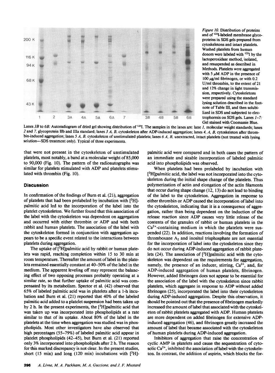 To investigate the association of lipid with the cytoskeleton of platelets during aggregation, rabbit and human platelets were isolated and labeled with [3H]palmitic acid; lipid extraction showed approximately 80% in phospholipid. Limited aggregation was induced with ADP or thrombin, and the cytoskeleton was isolated after lysis with 1% Triton X-100, 5 mM EGTA. Cytoskeleton from unactivated platelets had approximately 0.03% of the total label in the platelets, but after aggregation with ADP (2 microM) or thrombin (0.1 U/ml) for 20-30 s, 1.5-8% of the label was with the cytoskeleton. Fibrinogen enhanced aggregation and the association of label with the cytoskeleton; incorporation of label increased exponentially as aggregation proceeded, decreased exponentially during deaggregation, and appeared to be related to the number of sites of contact. Inhibitors that increase cyclic AMP inhibited aggregation and cytoskeletal labeling, but aspirin had no effect. Some experiments were done with DNase I and Ca2+ in the Triton X-100 lysis medium to cause actin depolymerization, under conditions in which the Ca2+-dependent protease activity was inhibited. This greatly reduced the association of label with the cytoskeleton at early time points, but when aggregation had proceeded further, a large proportion of the label was not dissociated by this treatment. These findings, electron microscopy, and the enrichment of the cytoskeleton of aggregated platelets with only some of the membrane proteins that were labeled by the 125I-lactoperoxidase method, indicated that with limited aggregation, the 3H-labeled lipid was mainly associated with the cytoskeleton and not with trapped membrane fragments resulting from incomplete lysis. Since the pattern of cytoskeleton labeling ([3H]palmitate) and the selective association of some membrane proteins with the cytoskeleton/lipid complex was the same with ADP and thrombin, the reactions must be dependent on aggregation and not on events associated with the release of granule contents.