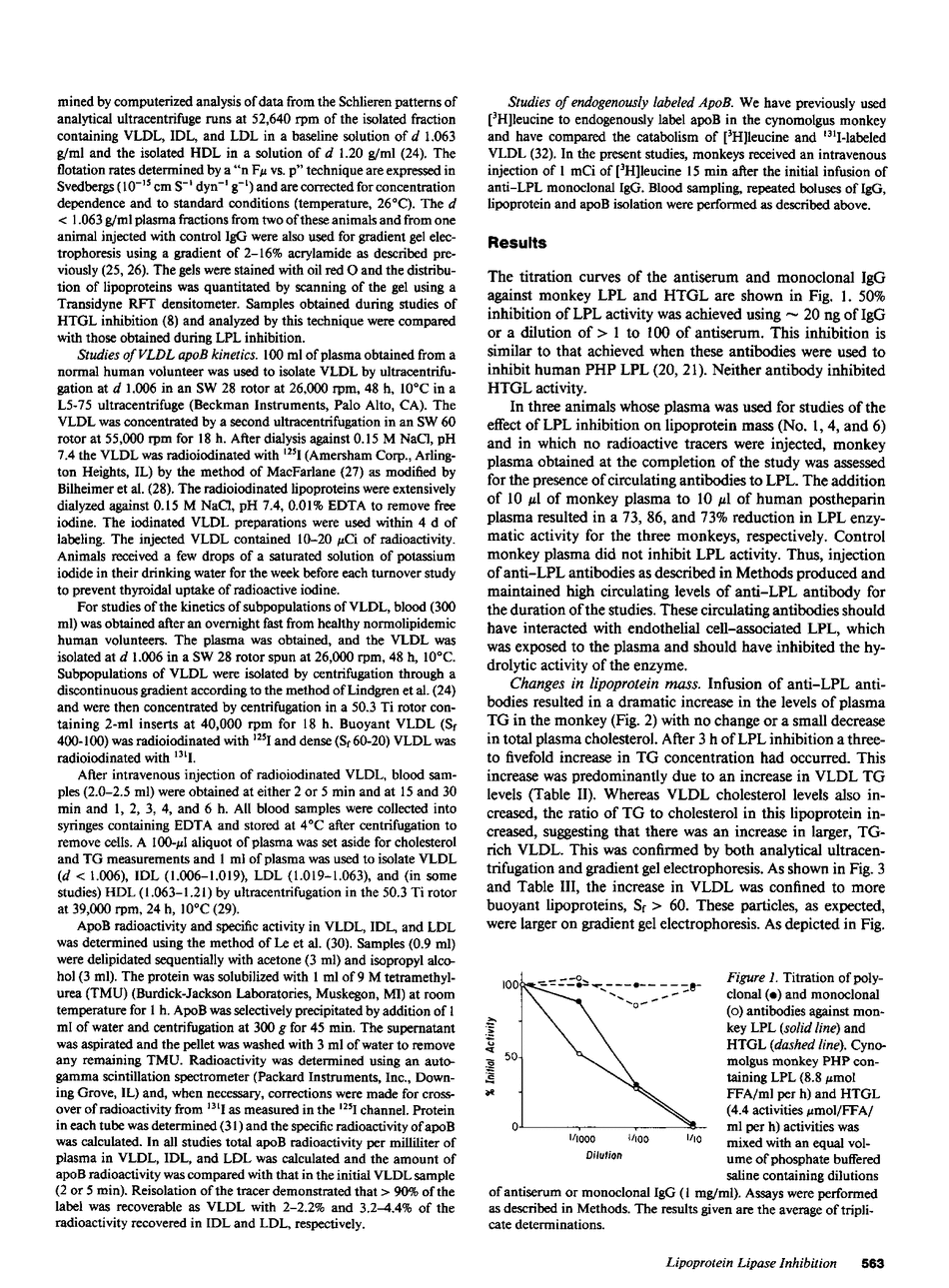 To clarify the role of lipoprotein lipase (LPL) in the catabolism of nascent and circulating very low density lipoproteins (VLDL) and in the conversion of VLDL to low density lipoproteins (LDL), studies were performed in which LPL activity was inhibited in the cynomolgus monkey by intravenous infusion of inhibitory polyclonal or monoclonal antibodies. Inhibition of LPL activity resulted in a three- to fivefold increase in plasma triglyceride levels within 3 h. Analytical ultracentrifugation and gradient gel electrophoresis demonstrated an increase predominantly in more buoyant, larger VLDL (Sf 400-60). LDL and high density lipoprotein (HDL) cholesterol levels fell during this same time period, whereas triglyceride in LDL and HDL increased. Kinetic studies, utilizing radiolabeled human VLDL, demonstrated that LPL inhibition resulted in a marked decrease in the catabolism of large (Sf 400-100) VLDL apolipoprotein B (apoB). The catabolism of more dense VLDL (Sf 60-20) was also inhibited, although to a lesser extent. However, there was a complete block in the conversion of tracer in both Sf 400-100 and 60-20 VLDL apoB into LDL during LPL inhibition. Similarly, endogenous labeling of VLDL using [3H]leucine demonstrated that in the absence of LPL, no radiolabeled apoB appeared in LDL. We conclude that although catabolism of dense VLDL continues in the absence of LPL, this enzyme is required for the generation of LDL.