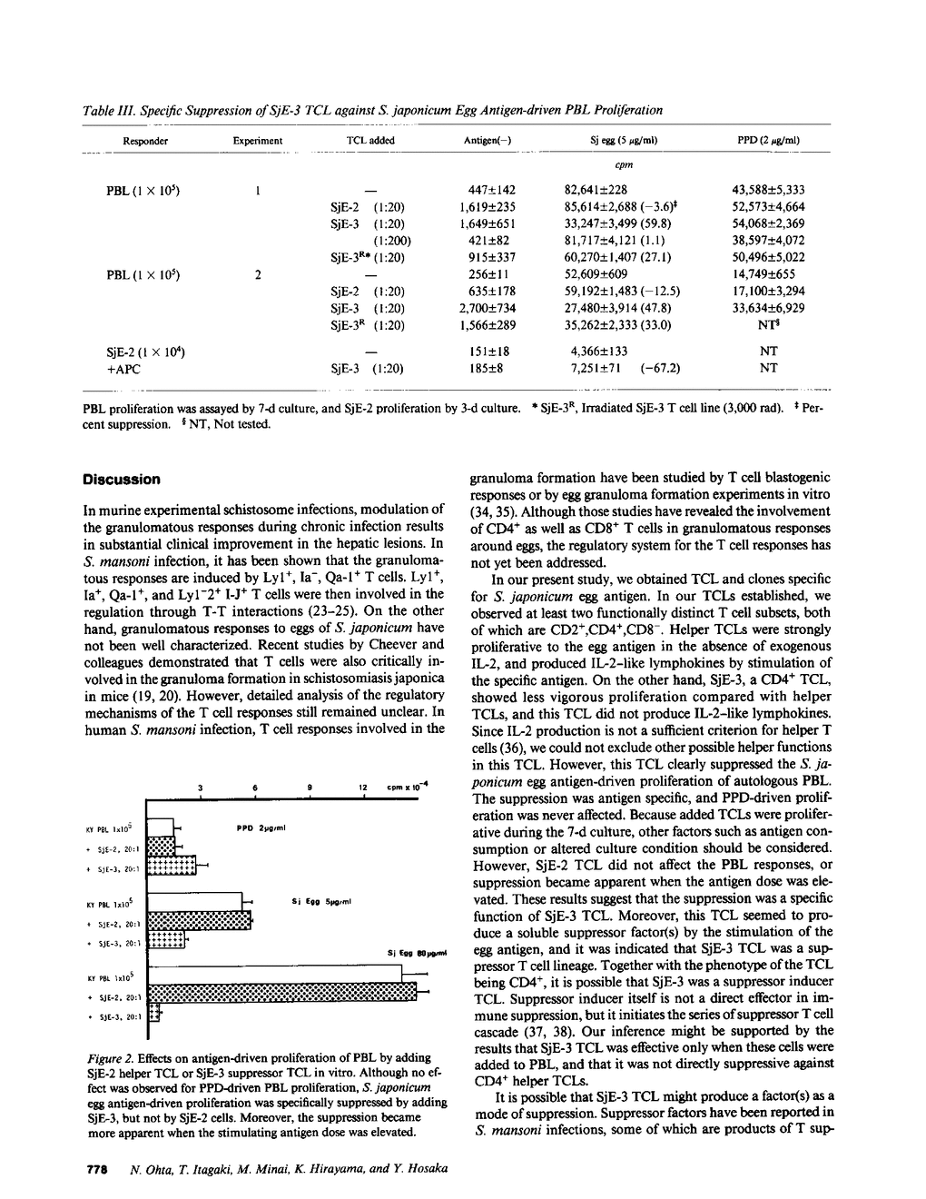 T cell lines (TCLs) specific for Schistosoma japonicum egg antigen were established from a patient with chronic schistosomiasis japonica to investigate the regulatory mechanism of S.japonicum egg antigen-driven T cell responses in man. All five TCLs tested were CD2+, CD4+, CD8-, and were strongly proliferative only to S. japonicum egg antigen in the absence of exogenous IL-2. All but one TCL produced IL-2-like lymphokines in vitro, indicating their helper T cell functions. One TCL, SjE-3, failed to produce IL-2-like lymphokines. Moreover, this TCL suppressed the specific proliferation of autologous peripheral blood lymphocytes to S. japonicum egg antigen. This TCL produced a soluble suppressor factor(s). These functional diversities among established TCLs were also confirmed by cloned T cells. Our observations might suggest that the regulatory system through helper and suppressor T-T interactions somehow involved in T cell responses to the egg antigen in human chronic schistosomiasis japonica.
