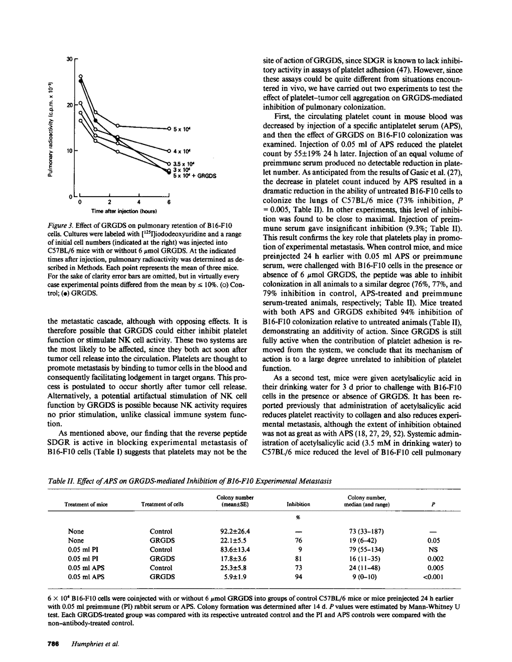 The experimental metastasis of B16-F10 murine melanoma cells is blocked by the anti-cell adhesive pentapeptide Gly-Arg-Gly-Asp-Ser (GRGDS) derived from the central cell-binding domain of fibronectin. In this report, we show that peptide treatment substantially extends the survival time for mice injected intravenously with B16-F10 cells (8/8 vs. 0/8 mice alive at 150 d), thereby demonstrating the potential efficacy of GRGDS treatment in protection against metastatic colonization. We have also examined the specificity of GRGDS activity by testing a series of related homologues for their effects on experimental metastasis. The overall profile of the relative inhibitory activities of these peptides closely matched their previously established capacity to disrupt adhesion in vitro. Lung retention studies with radiolabeled B16-F10 cells revealed an accelerated rate of cell loss from the lung 0-6 h after coinjection with the active peptide GRGDS. This early effect of GRGDS was consistent with its short circulatory half-life, which was found to be 8 min. Taken together, these results suggest that peptide-mediated inhibition of pulmonary colonization is due to interference with B16-F10 cell adhesion to structures in the target organ. Possible peptide interference in tumor cell-blood cell interactions was examined in order to assess (a) possible biological side-effects of peptide treatment and (b) whether such interactions might be an alternative mechanism for GRGDS-mediated inhibition of pulmonary colonization. GRGDS was found to retain full inhibitory activity when coinjected with B16-F10 cells into mice in which platelet function was impaired by acetylsalicylic acid treatment or into thrombocytopenic mice treated with antiplatelet serum (76-93% inhibition of colony formation). These data suggest that platelet involvement in the effects of the peptide is minimal. Similarly, GRGDS was also found to be a potent inhibitor of experimental metastasis in natural killer (NK) cell-deficient beige mice (86% inhibition), thereby discounting the possibility that GRGDS artifactually enhanced NK cell activity. We conclude as a result of these studies that cell-binding fibronectin peptides are specific inhibitors of experimental metastasis that prolong survival, that they appear to function by blocking the adhesion of B16-F10 cells to structures in the target organ, and that they do not appear to act through side effects on certain metastasis-related blood cell functions. In the future, derivatives of fibronectin peptides may be potentially useful prophylactic agents for interfering with the process of metastasis.