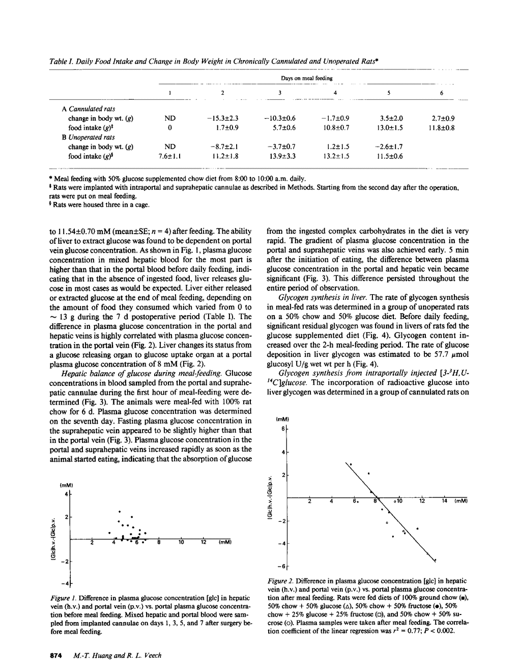 The pathway for hepatic glycogen synthesis in the postprandial state was studied in meal-fed rats chronically cannulated in the portal vein. Plasma glucose concentration in the portal vein was found to be 4.50 +/- 1.01 mM (mean +/- SE; n = 3) before a meal and 11.54 +/- 0.70 mM (mean +/- SE; n = 4) after a meal in rats meal-fed a diet consisting of 100% commercial rat chow for 7 d. The hepatic-portal difference of plasma glucose concentration showed that liver released glucose in the fasted state and either extracted or released glucose after feeding depending on plasma glucose concentration in the portal vein. The concentration of portal vein glucose at which liver changes from glucose releasing to glucose uptake was 8 mM, the Km of glucokinase [E.C. 2.7.1.12]. The rate of glycogen synthesis in liver during meal-feeding was found to be approximately 1 mumol glucosyl U/g wet wt/min in rats meal-fed a 50% glucose supplemented chow diet. The relative importance of the direct vs. indirect pathway for the replenishment of hepatic glycogen was determined by the incorporation of [3-3H,U-14C]glucose into liver glycogen. Labeled glucose was injected into the portal vein at the end of meal-feeding. The ratio of 3H/14C in the glucosyl units of glycogen was found to be 83-92% of the ratio in liver free glucose six minutes after the injection, indicating that the majority of exogenous glucose incorporated into glycogen did not go through glycolysis. The percent contribution of the direct versus indirect pathway was quantitated from the difference in the relative specific activity (RSA) of [3H] and [14C]-glycogen in rats infused with [3-3H,U-14C]glucose. No significant difference was found between the RSA of [3H]glycogen and [14C]glycogen, indicating further that the pathway for glycogen synthesis in liver from exogenous glucose is from the direct pathway. Our results do not support the thesis that the majority of liver glycogen is synthesized from glucose-6-phosphate derived from gluconeogenesis. Reasons for the discrepancy between current findings and other reports supporting the indirect pathway for glycogen synthesis in the liver are discussed.