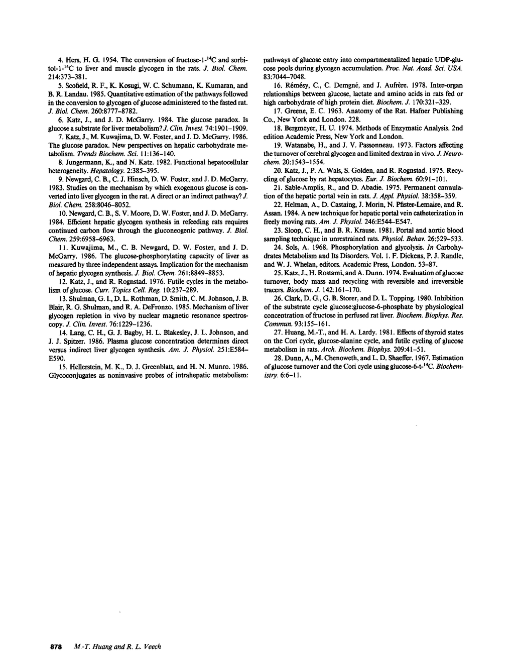 The pathway for hepatic glycogen synthesis in the postprandial state was studied in meal-fed rats chronically cannulated in the portal vein. Plasma glucose concentration in the portal vein was found to be 4.50 +/- 1.01 mM (mean +/- SE; n = 3) before a meal and 11.54 +/- 0.70 mM (mean +/- SE; n = 4) after a meal in rats meal-fed a diet consisting of 100% commercial rat chow for 7 d. The hepatic-portal difference of plasma glucose concentration showed that liver released glucose in the fasted state and either extracted or released glucose after feeding depending on plasma glucose concentration in the portal vein. The concentration of portal vein glucose at which liver changes from glucose releasing to glucose uptake was 8 mM, the Km of glucokinase [E.C. 2.7.1.12]. The rate of glycogen synthesis in liver during meal-feeding was found to be approximately 1 mumol glucosyl U/g wet wt/min in rats meal-fed a 50% glucose supplemented chow diet. The relative importance of the direct vs. indirect pathway for the replenishment of hepatic glycogen was determined by the incorporation of [3-3H,U-14C]glucose into liver glycogen. Labeled glucose was injected into the portal vein at the end of meal-feeding. The ratio of 3H/14C in the glucosyl units of glycogen was found to be 83-92% of the ratio in liver free glucose six minutes after the injection, indicating that the majority of exogenous glucose incorporated into glycogen did not go through glycolysis. The percent contribution of the direct versus indirect pathway was quantitated from the difference in the relative specific activity (RSA) of [3H] and [14C]-glycogen in rats infused with [3-3H,U-14C]glucose. No significant difference was found between the RSA of [3H]glycogen and [14C]glycogen, indicating further that the pathway for glycogen synthesis in liver from exogenous glucose is from the direct pathway. Our results do not support the thesis that the majority of liver glycogen is synthesized from glucose-6-phosphate derived from gluconeogenesis. Reasons for the discrepancy between current findings and other reports supporting the indirect pathway for glycogen synthesis in the liver are discussed.