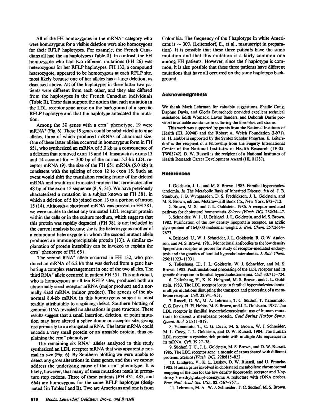 The low density lipoprotein (LDL) receptors in fibroblasts from 132 subjects with the clinical syndrome of homozygous familial hypercholesterolemia were analyzed by immunoprecipitation with an anti-LDL receptor monoclonal antibody. 16 of the 132 cell strains (12%) synthesized no immunodetectable LDL receptor protein, indicating the presence of two mutant genes that failed to produce cross-reacting material (crm- mutations). DNA and mRNA from 15 of the 16 crm- patients, representing 30 crm- genes, were available for further study. Haplotype analysis based on 10 restriction fragment length polymorphisms (RFLPs) suggested that the 30 crm- genes represent 13 mutant alleles. Four of the alleles produced no mRNA. Three of these four mRNA- alleles had large deletions ranging from 6 to 20 kb that eliminated the promoter region of the gene. The fourth mRNA- allele did not contain any deletion or alteration in the promoter sequence; the reason for the mRNA- phenotype was not apparent. Nine alleles were positive for mRNAs, of which three encoded mRNAs of abnormal size. One of the abnormal mRNAs was produced by a gene harboring a deletion, and another was produced by a gene with a complex rearrangement. The third abnormal-sized mRNA (3.1 kb larger than normal) was produced by an allele that had no detectable alterations as judged by Southern blotting. The other six mRNA+ alleles appeared normal by Southern blotting and produced normal-sized mRNA but no receptor protein. The current studies demonstrate that mRNA analysis coupled with haplotype determination by Southern blot analysis can be used to classify crm- mutations at a genetic locus where multiple alleles exist.