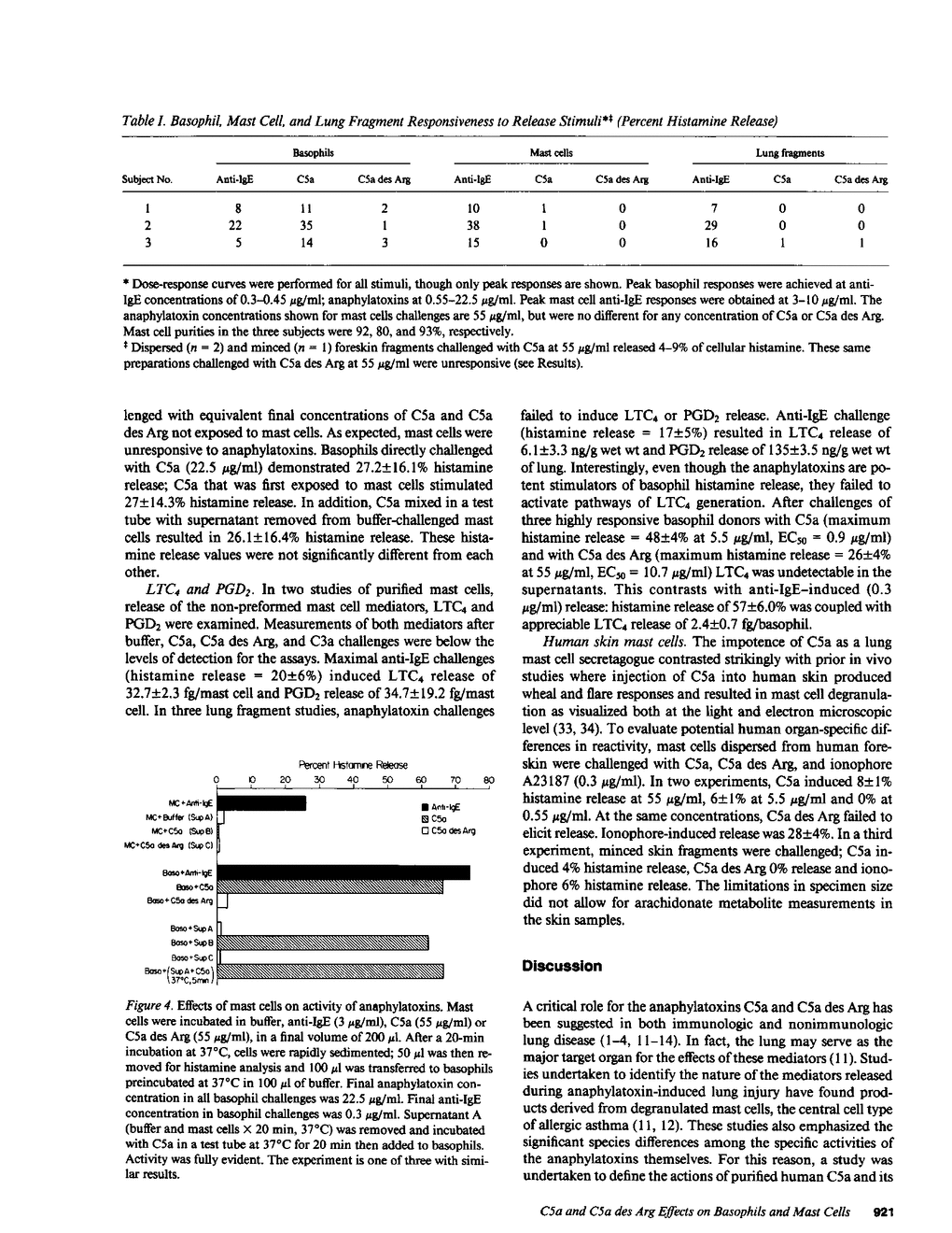 The ability of purified anaphylatoxins to induce human lung mast cell mediator release was investigated. In eight anti-IgE responsive (histamine release = 22 +/- 5%, mean +/- SEM) mast cell preparations of 1-96% purity, C5a and C5a des Arg (0.55 pg/ml to 55 micrograms/ml), failed to elicit or potentiate histamine release; lung fragments were similarly unresponsive. The related peptide C3a was also inactive. All anaphylatoxins failed to induce mast cell leukotriene C4 (LTC4) and prostaglandin D2 (PGD2) release. LTC4 release was also negligible from basophils where C5a was a potent histamine release stimulus. Supernatants from C5a-challenged mast cells remained fully active on basophils, excluding carboxypeptidase inactivation of C5a as an explanation for the lung mast cell results. In contrast to lung, skin mast cells were C5a-responsive (histamine release = 8 +/- 1%, at 55 micrograms/ml, n = 2). We conclude that C5a, though devoid of activity on the human lung mast cell, is a human basophil and skin mast cell secretagogue. These findings demonstrate significant organ-specific heterogeneity in mast cell responsiveness.