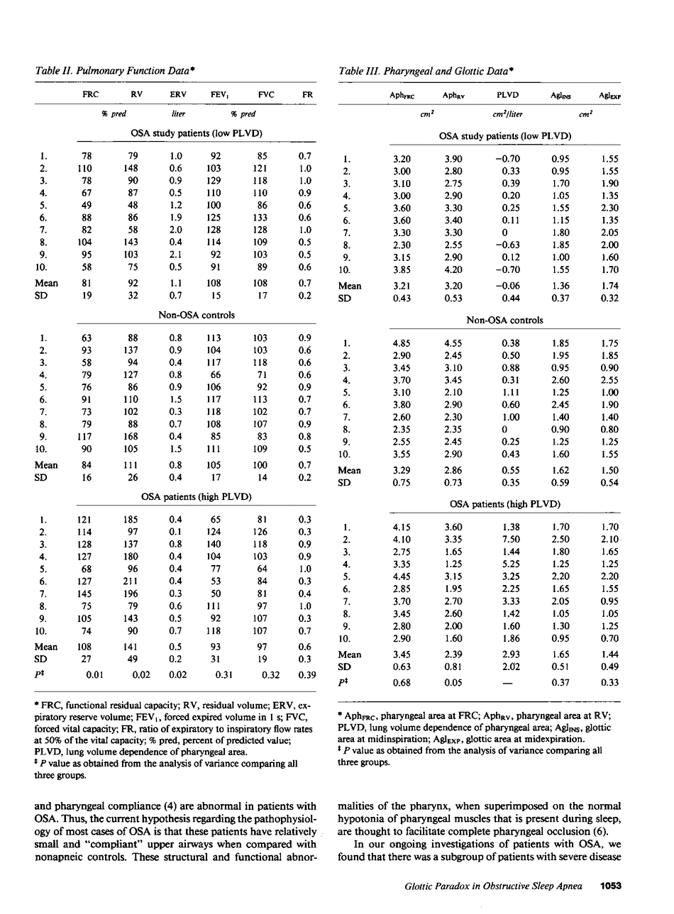 Most patients with obstructive sleep apnea have increased pharyngeal collapsibility (defined in the present study as an increased lung volume dependence of pharyngeal area), which predisposes them to upper airway occlusion during sleep. However, there are patients with severe obstructive sleep apnea who have low-normal pharyngeal collapsibility. The factors leading to nocturnal upper airway obstruction in such patients have not been ascertained. We studied 10 overweight male patients with severe obstructive sleep apnea and low-normal pharyngeal collapsibility to determine the site of upper airway pathology in these patients. We found that all 10 patients exhibited paradoxical inspiratory narrowing of the glottis during quiet tidal breathing. This phenomenon was not observed in a matched group of 10 snoring, nonapneic male controls. We conclude that paradoxical glottic narrowing may be a contributing factor in the pathogenesis of upper airway obstruction in patients with severe obstructive sleep apnea who have low-normal pharyngeal collapsibility.