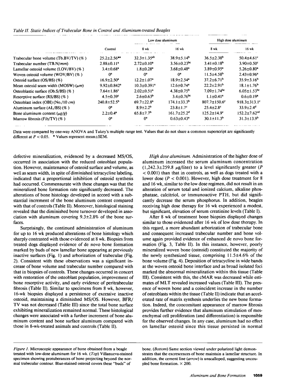 To define the primary effects of aluminum on bone in the mammalian species, we examined the dose/time-dependent actions of aluminum in normal beagles. Administration of low dose aluminum (0.75 mg/kg) significantly elevated the serum aluminum (151.7 +/- 19.9 micrograms/liter) compared with that in controls (4.2 +/- 1.35 micrograms/liter) but did not alter the calcium, creatinine, or parathyroid hormone. After 8 wk of therapy, bone biopsies displayed reduced bone resorption (2.6 +/- 0.63 vs. 4.5 +/- 0.39%) and osteoblast covered bone surfaces (2.02 +/- 0.51 vs. 7.64 +/- 1.86%), which was indicative of low turnover. In contrast, prolonged treatment resulted in increased bone volume and trabecular number (38.9 +/- 1.35 vs. 25.2 +/- 2.56% and 3.56 +/- 0.23 vs. 2.88 +/- 0.11/mm) which was consistent with uncoupled bone formation. Administration of higher doses of aluminum (1.20 mg/kg) increased the serum aluminum further (1242.3 +/- 259.8 micrograms/liter) but did not affect calcium, creatinine, or parathyroid hormone. However, after 8 wk of treatment, bone biopsies displayed changes similar to those after long-term, low-dose therapy. In this regard, an increased trabecular number (3.41 +/- 0.18/mm) and bone volume (36.5 +/- 2.38%) again provided evidence of uncoupled bone formation. In contrast, in this instance poorly mineralized woven bone contributed to the enhanced bone volume. High-dose treatment for 16 wk further enhanced bone volume (50.4 +/- 4.61%) and trabecular number (3.90 +/- 0.5/mm). These observations illustrate that aluminum may stimulate uncoupled bone formation and induce a positive bone balance. This enhancement of bone histogenesis contrasts with the effects of pharmacologic agents that alter the function of existing bone remodeling units.