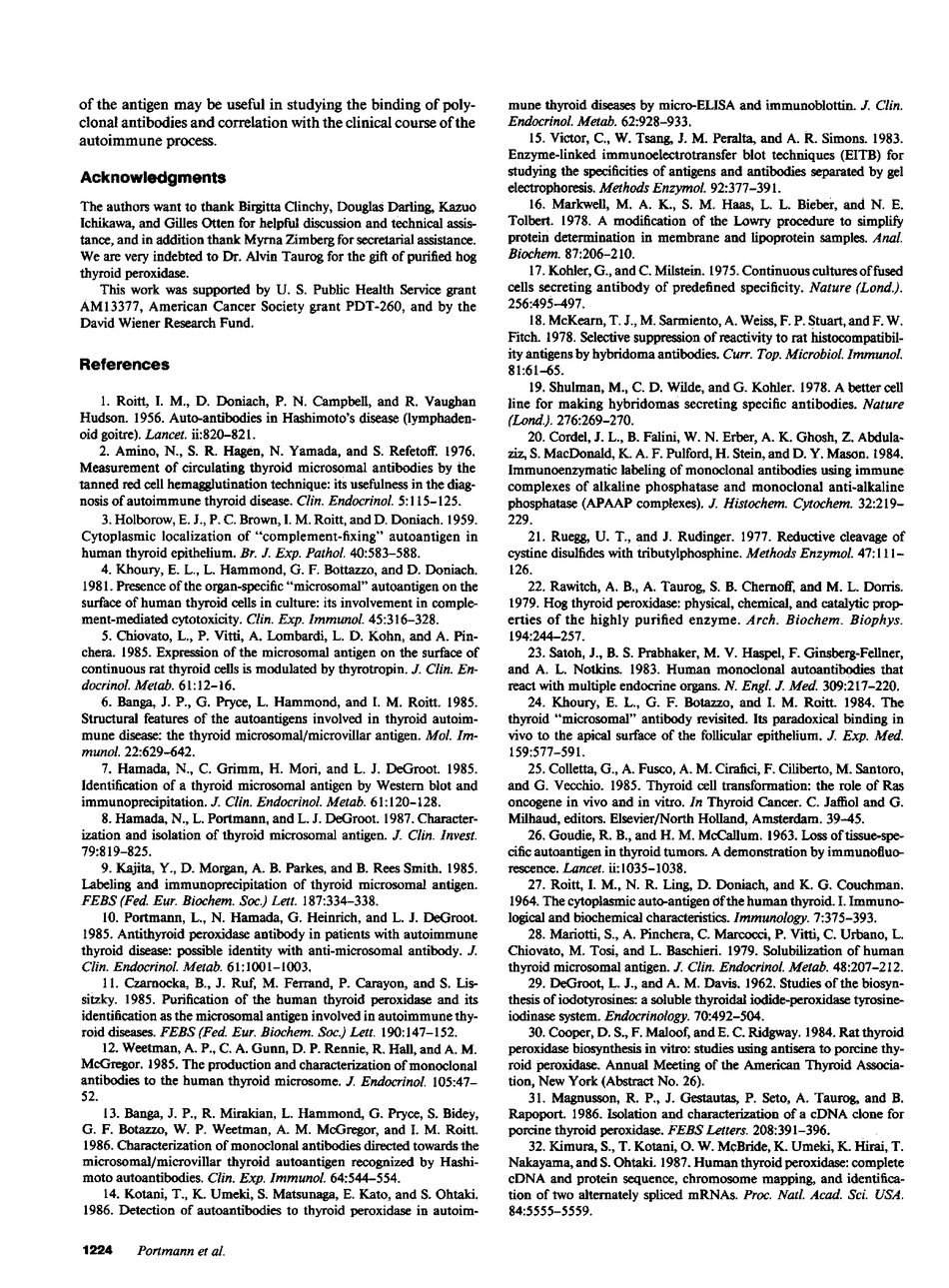 MAb directed to the thyroid microsomal antigen have been developed. All bound to 101- and 107-kD bands in Western blot analysis using thyroid microsomal fraction as antigen. The MAb also bound to microsomal proteins immunoprecipitated by serum from patients having a high titer of anti-microsomal antibody but no antibodies to thyroglobulin or thyrotropin-stimulating hormone receptor. The pattern of binding was related to the amount of reducing agent. The 101- and 107-kD bands were increased by addition of dithiothreitol whereas, in its absence, numerous bands of higher molecular weight were present, suggesting a multimeric protein structure. Despite the inability to immunoprecipitate thyroid peroxidase (TPO) enzymatic activity, the MAb bound intensively in Western blot to denatured purified hog TPO and to denatured immunopurified human TPO. Trypsin digestion of the 101-107-kD antigen produced a doublet of 84-88 kD that was still immunoreactive with MAb. One of five polyclonal sera tested (with a microsomal antibody titer greater than 1/20,480 measured by the tanned red cell hemagglutination technique) also recognized the 84-88 kD trypsin fragments. Addition of V8 protease led to a disappearance of the 107-kD protein, but not the 101-kD protein, proving that this antigen is formed by two different polypeptides. The MAb bound strongly to thyroid epithelium, whereas binding to papillary carcinoma was absent or low and moderate for follicular and Hurthle cell carcinoma. This study indicates that the thyroid microsomal antigen and TPO are identical and are constituted of two different polypeptides. On SDS-PAGE the antigen appears as two contiguous bands which share common epitopes but are not identical, as proven by their size and difference in susceptibility to proteolytic digestion. The immunoreactivity of the molecule is highly dependent on a trypsin-sensitive site, which appears important in the recognition of the antigen by polyclonal sera and may have biological importance. The expression of microsomal antigenicity is variable among various thyroid carcinomas.