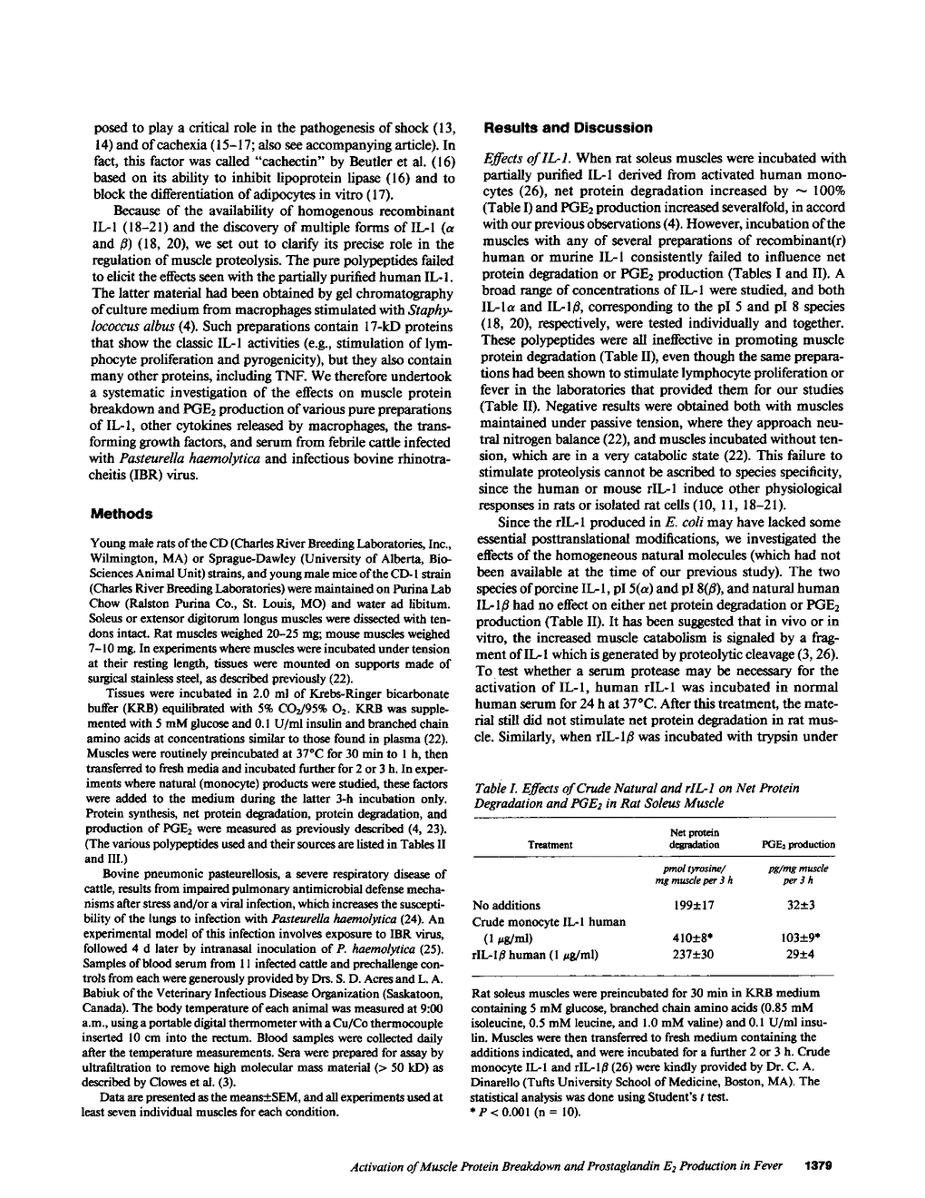 During sepsis or after injection of endotoxin into rats, there is a large increase in muscle protein breakdown and prostaglandin E2 (PEG2) production. Prior studies showed that partially purified interleukin 1 (IL-1) from human monocytes can stimulate these processes when added to isolated rat muscles. The availability of pure recombinant IL-1 and other monokines has allowed us to investigate the identity of the active agent in this process. Incubation of muscles with recombinant human or murine IL-1 alpha or IL-1 beta or with IL-1 plus a phorbol ester did not stimulate muscle proteolysis or PGE2 production. Homogeneous natural porcine IL-1 ("catabolin") and mouse or human IL-1 beta were also not effective in vitro. In addition, a variety of other human cytokines, including tumor necrosis factor ("cachectin"), epidermal thymocyte-activating factor, eosinophil cytotoxicity-enhancing factor, interferon-alpha, beta, and gamma, platelet-derived growth factor, and transforming growth factor (TGF) beta, which are all released by activated macrophages, TGF-alpha, or mixtures of these polypeptides, also failed to activate proteolysis or PGE2 production. By contrast, a large increase in net protein breakdown could be induced in the rat soleus by polypeptides released from porcine monocytes or by the serum from febrile cattle which had been injected with Pasteurella haemolytica or bovine rhinotracheitis virus. Therefore, a still-unidentified product of activated monocytes appears to be responsible for the negative nitrogen balance that accompanies infectious illness.