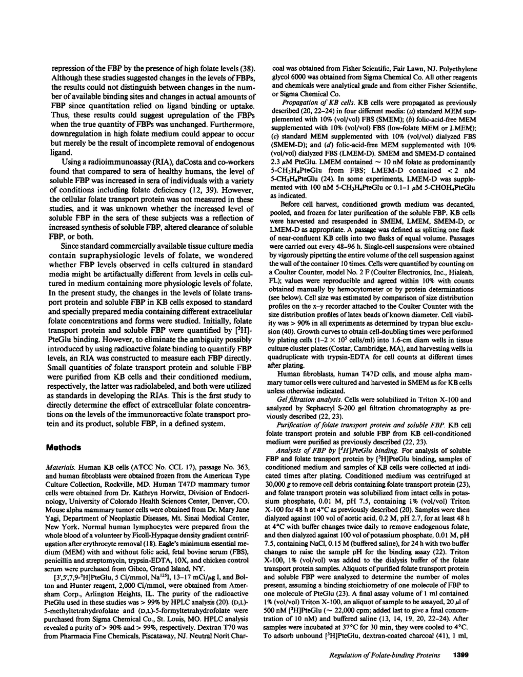 The influence of extracellular folate concentration on cellular levels of the folate transport protein and its soluble product was studied directly in cultured human nasopharyngeal carcinoma (KB) cells. As determined by radioimmunoassay, levels of the folate transport protein and the soluble folate-binding protein were 58 +/- 17 (mean +/- SD) and 5 +/- 2 pmol/mg cell protein, respectively, in KB cells maintained in standard medium (containing 2,300 nM folic acid). These levels significantly increased to 182 +/- 34 and 26 +/- 6 pmol/mg cell protein, respectively, in KB cells serially passaged in low folate medium (containing 2-10 nM 5-methyltetrahydrofolate). Increases in folate-binding protein levels occurred more rapidly in KB cells serially passaged in very low folate medium containing less than 2 nM folate and were prevented by the addition of 100 nM 5-methyltetrahydrofolate or 0.1-1 microM 5-formyltetrahydrofolate to this medium. When KB cells which had been passaged in low folate medium were passaged back into either standard medium or low folate medium supplemented with reduced folates, the levels of both folate-binding proteins fell linearly towards the levels in KB cells continuously maintained in standard medium. The folate transport protein was identified in and underwent similar changes in human and mouse mammary tumor cells. These studies indicate that the folate transport system is probably regulated by the extracellular folate concentration through changes in intracellular metabolite levels.