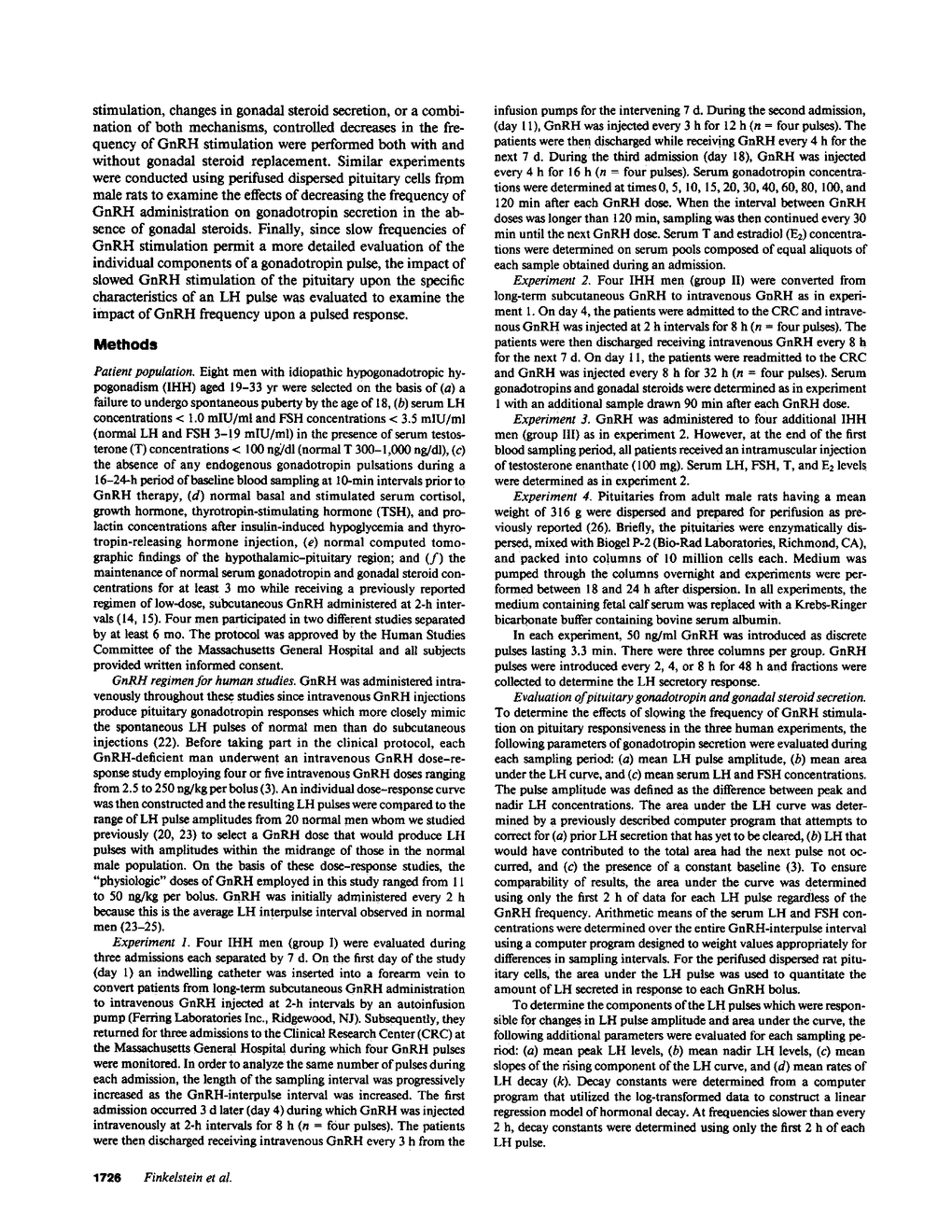 The effects of decreasing the frequency of pulsatile gonadotropin-releasing hormone (GnRH) stimulation on pituitary responsiveness were studied in (a) men with isolated GnRH deficiency who had achieved normal sex steroid levels during prior long-term pulsatile GnRH replacement and (b) perifused dispersed pituitary cells from male rats in the absence of sex steroids. In three groups of four GnRH-deficient men, the frequency of GnRH stimulation was decreased at weekly intervals from (a) every 2-3-4 h (group I), (b) every 2-8 h without testosterone replacement (group II), or (c) every 2-8 h with testosterone replacement (group III). In three groups of three columns of perifused dispersed pituitary cells, pulses of GnRH were administered every 2, 4, or 8 h. In groups I and II, mean area under the luteinizing hormone (LH) curve increased (P less than 0.025) and serum testosterone levels fell (P less than 0.035) as the frequency of GnRH stimulation was decreased. In group III, the area under the LH curve also increased (P less than 0.01) although serum testosterone levels were constant, thereby demonstrating that the increase in pituitary responsiveness to slow frequencies of GnRH stimulation occurs independently of changes in the sex steroid hormonal milieu. The area under the LH curve also increased in the perifused dispersed rat pituitary cells when the frequency of GnRH administration was decreased to every 8 h (P less than 0.05), thus demonstrating that the enhanced pituitary responsiveness to slow frequencies of GnRH stimulation is maintained even in the complete absence of gonadal steroids. Nadir LH levels fell in all three groups (P less than 0.01) as the frequency of GnRH stimulation was decreased. In contrast, mean peak LH levels, the rate of LH rise, and the rate of endogenous LH decay were constant as the frequency of GnRH stimulation was decreased. Finally, as the GnRH interpulse interval increased, mean LH levels fell, and mean follicle-stimulating hormone levels were stable or fell. These results indicate that (a) pituitary responsiveness to GnRH increases at slower frequencies of GnRH stimulation in models both in vivo and in vitro, (b) these changes in pituitary responsiveness occur independently of changes in gonadal steroid secretion, and (c) the increases in LH pulse amplitude and area under the curve at slow frequencies of GnRH stimulation are due to decreases in nadir, but not peak, LH levels. Slowing of the frequency of GnRH secretion may be an important independent variable in the control of pituitary gonadotropin secretion.