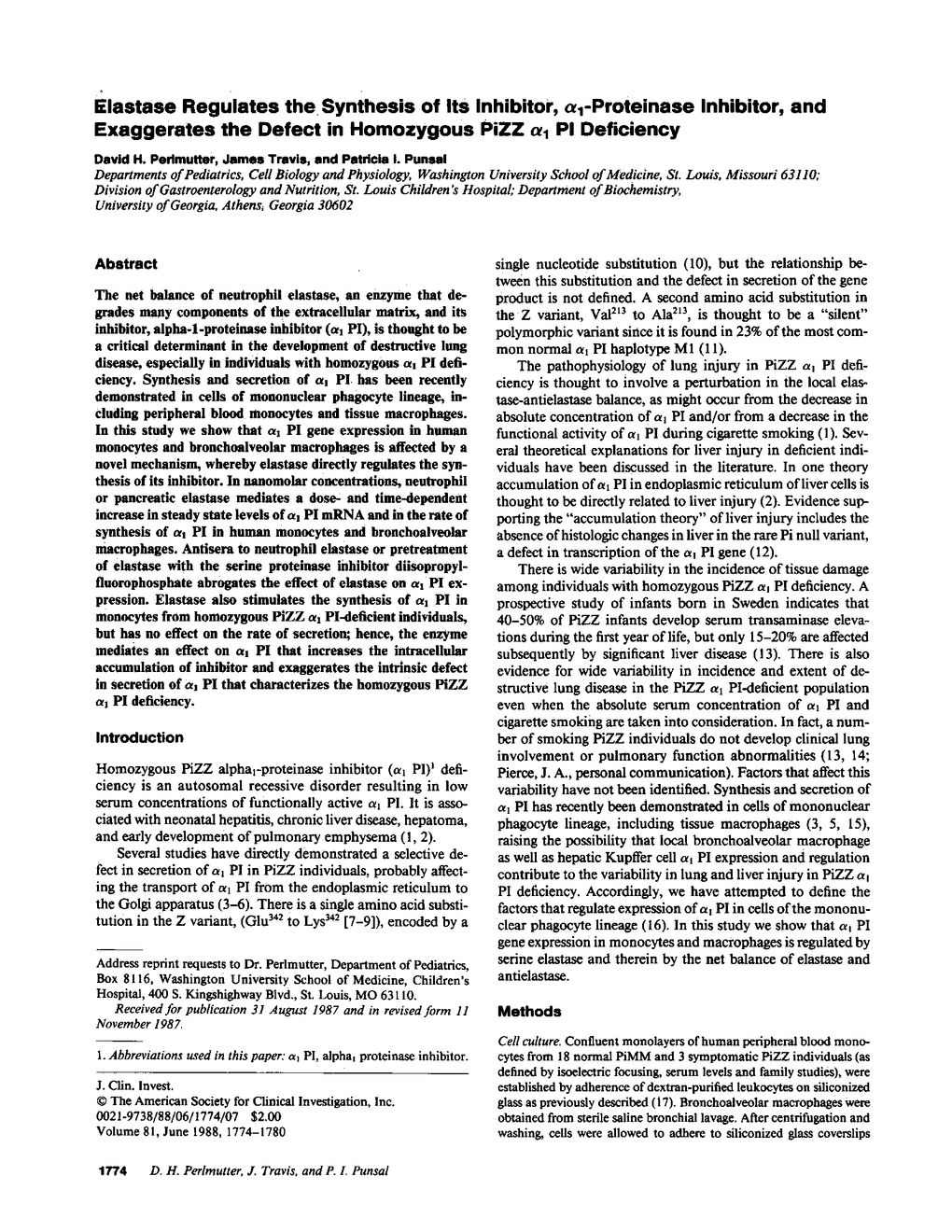 The net balance of neutrophil elastase, an enzyme that degrades many components of the extracellular matrix, and its inhibitor, alpha-1-proteinase inhibitor (alpha 1 PI), is thought to be a critical determinant in the development of destructive lung disease, especially in individuals with homozygous alpha 1 PI deficiency. Synthesis and secretion of alpha 1 PI has been recently demonstrated in cells of mononuclear phagocyte lineage, including peripheral blood monocytes and tissue macrophages. In this study we show that alpha 1 PI gene expression in human monocytes and bronchoalveolar macrophages is affected by a novel mechanism, whereby elastase directly regulates the synthesis of its inhibitor. In nanomolar concentrations, neutrophil or pancreatic elastase mediates a dose- and time-dependent increase in steady state levels of alpha 1 PI mRNA and in the rate of synthesis of alpha 1 PI in human monocytes and bronchoalveolar macrophages. Antisera to neutrophil elastase or pretreatment of elastase with the serine proteinase inhibitor diisopropylfluorophosphate abrogates the effect of elastase on alpha 1 PI expression. Elastase also stimulates the synthesis of alpha 1 PI in monocytes from homozygous PiZZ alpha 1 PI-deficient individuals, but has no effect on the rate of secretion; hence, the enzyme mediates an effect on alpha 1 PI that increases the intracellular accumulation of inhibitor and exaggerates the intrinsic defect in secretion of alpha 1 PI that characterizes the homozygous PiZZ alpha 1 PI deficiency.