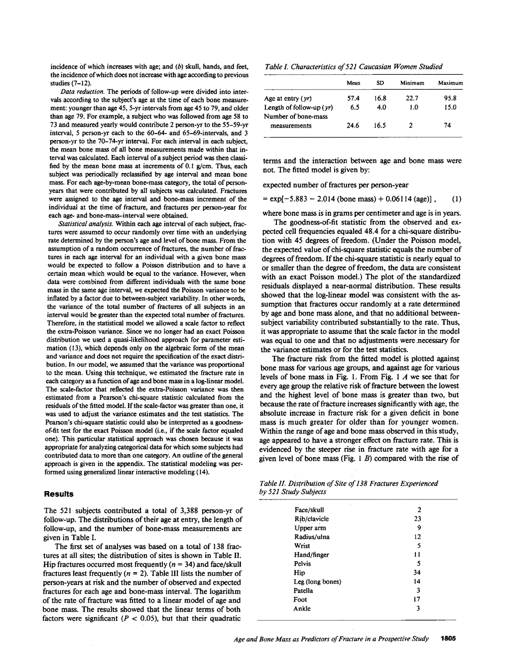To study the effect of bone mass on the risk of fracture, we followed 521 Caucasian women over an average of 6.5 yr and took repeated bone mass measurements at the radius. We observed 138 nonspinal fractures in 3,388 person-yr. The person-years of follow-up and the incident fractures were cross-classified by age and bone mass. The incidence of fracture was then fitted to a log-linear model in age and bone mass. It was found that incidence of fracture increased with both increasing age and decreasing radius bone mass. When subsets of fractures were examined it was found that age was a stronger predictor of hip fractures, whereas midshaft radius bone mass was a stronger predictor of fractures at the distal forearm. We concluded that bone mass is a useful predictor of fractures but that other age-related factors associated with fractures need to be identified.