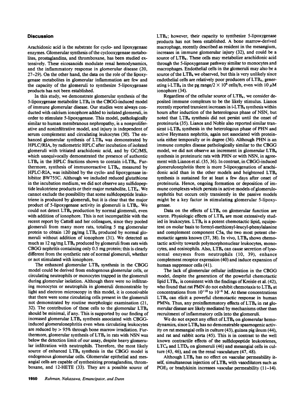We examined glomerular synthesis of the 5-lipoxygenase metabolite, LTB4, in normal and immune-injured rat glomeruli. Glomeruli isolated from normal rats and from rats with nephrotoxic serum nephritis (NSN), passive Heymann nephritis (PHN) and cationic bovine gamma globulin (CBGG)-induced glomerulonephritis were incubated with the calcium ionophore A23187 (3 microM). Lipids in the glomeruli and media were extracted with ethyl acetate, and were purified and fractionated by HPLC. Immunoreactive-LTB4 (i-LTB4) was determined by radioimmunoassay on HPLC fractions with a detection limit of 50 pg of i-LTB4. A large peak of i-LTB4 that comigrated with authentic LTB4 was found exclusively in glomeruli isolated from the CBGG-injected rats. Addition of the lipoxygenase inhibitor BW755C (50 micrograms/ml) to glomerular incubation resulted in greater than 90% inhibition of i-LTB4. Synthesis of i-LTB4 by glomeruli from normal, NSN and PHN rats was undetectable. Glomerular LTB4 synthesis by CBGG-injected rats was confirmed by radiometric HPLC and by gas chromatography mass-spectroscopy (GC-MS) analysis. In order to rule out synthesis of LTB4 by neutrophils entrapped in the glomeruli, a group of rats received 1,000 rad total body x irradiation, with shielding of the kidneys before induction of CBGG glomerulonephritis. Despite greater than 95% reduction in total leukocyte count, glomerular synthesis of LTB4 remained enhanced. Augmented glomerular synthesis of the proinflammatory lipid, LTB4, in the CBGG model of glomerular disease could have an important role in the development of glomerular injury and proteinuria.