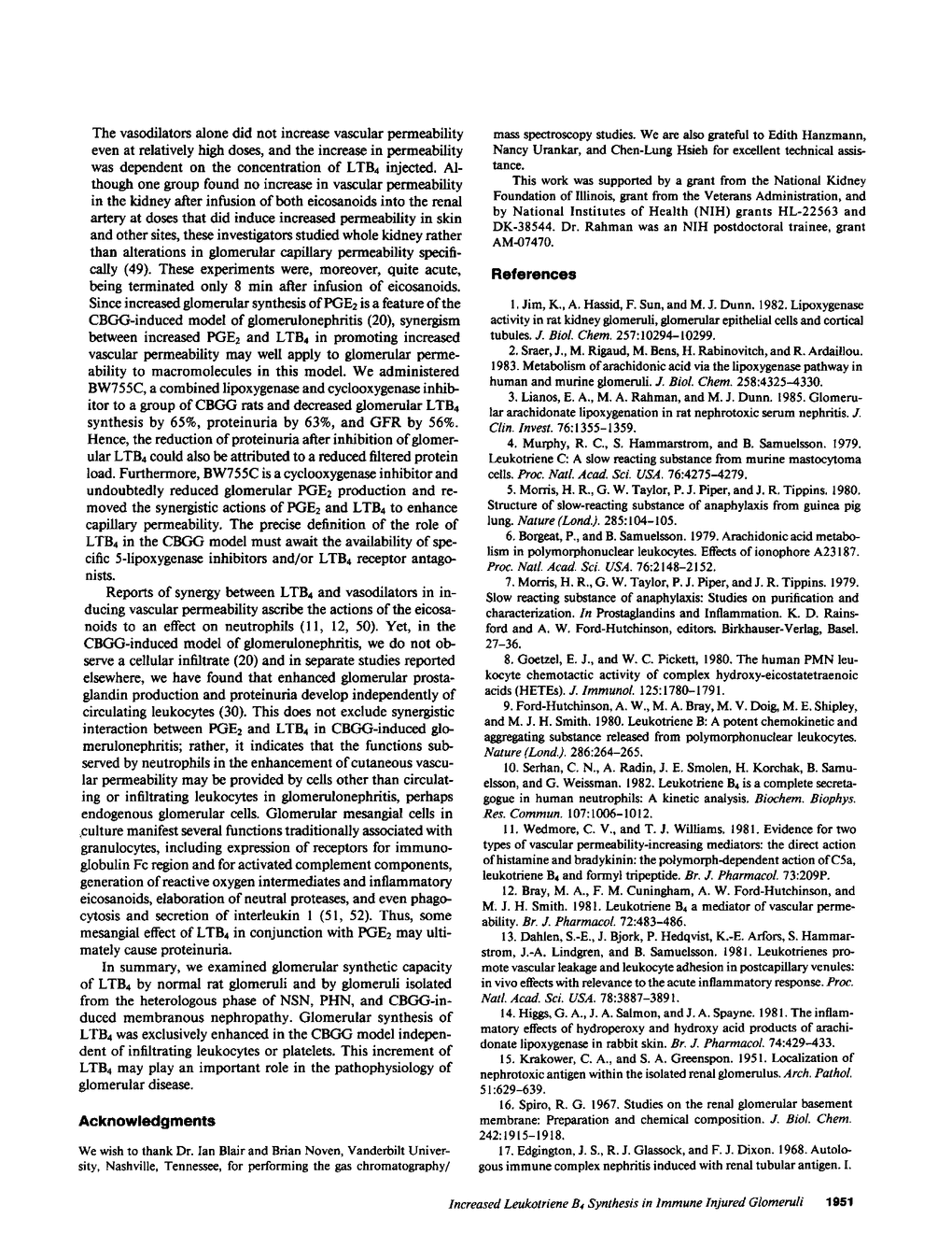 We examined glomerular synthesis of the 5-lipoxygenase metabolite, LTB4, in normal and immune-injured rat glomeruli. Glomeruli isolated from normal rats and from rats with nephrotoxic serum nephritis (NSN), passive Heymann nephritis (PHN) and cationic bovine gamma globulin (CBGG)-induced glomerulonephritis were incubated with the calcium ionophore A23187 (3 microM). Lipids in the glomeruli and media were extracted with ethyl acetate, and were purified and fractionated by HPLC. Immunoreactive-LTB4 (i-LTB4) was determined by radioimmunoassay on HPLC fractions with a detection limit of 50 pg of i-LTB4. A large peak of i-LTB4 that comigrated with authentic LTB4 was found exclusively in glomeruli isolated from the CBGG-injected rats. Addition of the lipoxygenase inhibitor BW755C (50 micrograms/ml) to glomerular incubation resulted in greater than 90% inhibition of i-LTB4. Synthesis of i-LTB4 by glomeruli from normal, NSN and PHN rats was undetectable. Glomerular LTB4 synthesis by CBGG-injected rats was confirmed by radiometric HPLC and by gas chromatography mass-spectroscopy (GC-MS) analysis. In order to rule out synthesis of LTB4 by neutrophils entrapped in the glomeruli, a group of rats received 1,000 rad total body x irradiation, with shielding of the kidneys before induction of CBGG glomerulonephritis. Despite greater than 95% reduction in total leukocyte count, glomerular synthesis of LTB4 remained enhanced. Augmented glomerular synthesis of the proinflammatory lipid, LTB4, in the CBGG model of glomerular disease could have an important role in the development of glomerular injury and proteinuria.