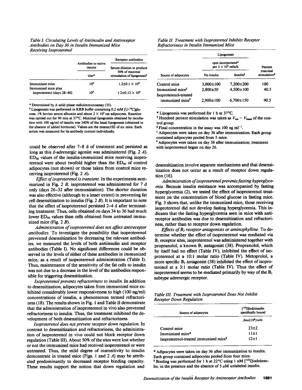 In previous studies we reported that immunization of mice with ungulate insulins induced the development of antiinsulin antibodies, which include an idiotype that appeared to recognize the part of the insulin molecule recognized by the hormone receptor. The antiinsulin antibodies of this idiotype were replaced spontaneously by antiidiotypic antibodies. The antiidiotypic antibodies, which persisted for about 14 d, mimicked insulin and functioned as antibodies to the insulin receptor. They induced down regulation, desensitization and refractoriness of the insulin receptor and disturbances in glucose homeostasis in vivo (Shechter, Y., D. Elias, R. Maron, and I.R. Cohen., 1984; Elias, D., R. Maron, I.R. Cohen, and Y. Shechter. 1984, J. Biol. Chem. 259: 6411-6419). We now report that effects of the antiidiotypic antibodies on the insulin receptor effector system can be modified pharmacologically. Administration of the beta-adrenergic agonist isoproterenol during the period of insulin resistance (days 26-40 after primary immunization), largely restored fat cell responsiveness to insulin, and eliminated the appearance of fasting hyperglycemia. This restoration appeared to be caused by inhibition of both insulin receptor desensitization and refractoriness. In contrast, down regulation of insulin receptors was not reversed by isoproterenol treatment in vivo. The effects of treatment with isoproterenol persisted for 2-4 d after termination of treatment. The beta-antagonist, propranolol and more so, the beta 1a-antagonist metoprolol, specifically blocked the effect of isoproterenol at a molar ratio of 3-10:1. Oral administration of the cAMP phosphodiesterase inhibitor, aminophylline, was also effective in inhibiting the development of desensitization in fat cells. These results indicate that treatment with beta 1-adrenergic agonists in vivo, or other agents that elevate cellular cAMP levels, can inhibit the development of the "postbinding" defects induced by insulin-mimicking, antireceptor antibodies. These observations have both basic and clinical implications.