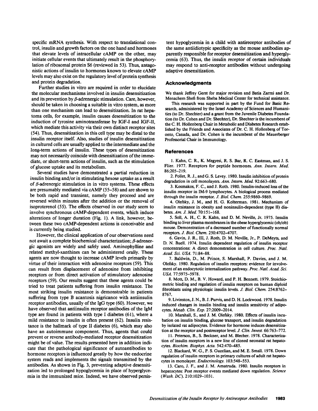 In previous studies we reported that immunization of mice with ungulate insulins induced the development of antiinsulin antibodies, which include an idiotype that appeared to recognize the part of the insulin molecule recognized by the hormone receptor. The antiinsulin antibodies of this idiotype were replaced spontaneously by antiidiotypic antibodies. The antiidiotypic antibodies, which persisted for about 14 d, mimicked insulin and functioned as antibodies to the insulin receptor. They induced down regulation, desensitization and refractoriness of the insulin receptor and disturbances in glucose homeostasis in vivo (Shechter, Y., D. Elias, R. Maron, and I.R. Cohen., 1984; Elias, D., R. Maron, I.R. Cohen, and Y. Shechter. 1984, J. Biol. Chem. 259: 6411-6419). We now report that effects of the antiidiotypic antibodies on the insulin receptor effector system can be modified pharmacologically. Administration of the beta-adrenergic agonist isoproterenol during the period of insulin resistance (days 26-40 after primary immunization), largely restored fat cell responsiveness to insulin, and eliminated the appearance of fasting hyperglycemia. This restoration appeared to be caused by inhibition of both insulin receptor desensitization and refractoriness. In contrast, down regulation of insulin receptors was not reversed by isoproterenol treatment in vivo. The effects of treatment with isoproterenol persisted for 2-4 d after termination of treatment. The beta-antagonist, propranolol and more so, the beta 1a-antagonist metoprolol, specifically blocked the effect of isoproterenol at a molar ratio of 3-10:1. Oral administration of the cAMP phosphodiesterase inhibitor, aminophylline, was also effective in inhibiting the development of desensitization in fat cells. These results indicate that treatment with beta 1-adrenergic agonists in vivo, or other agents that elevate cellular cAMP levels, can inhibit the development of the "postbinding" defects induced by insulin-mimicking, antireceptor antibodies. These observations have both basic and clinical implications.