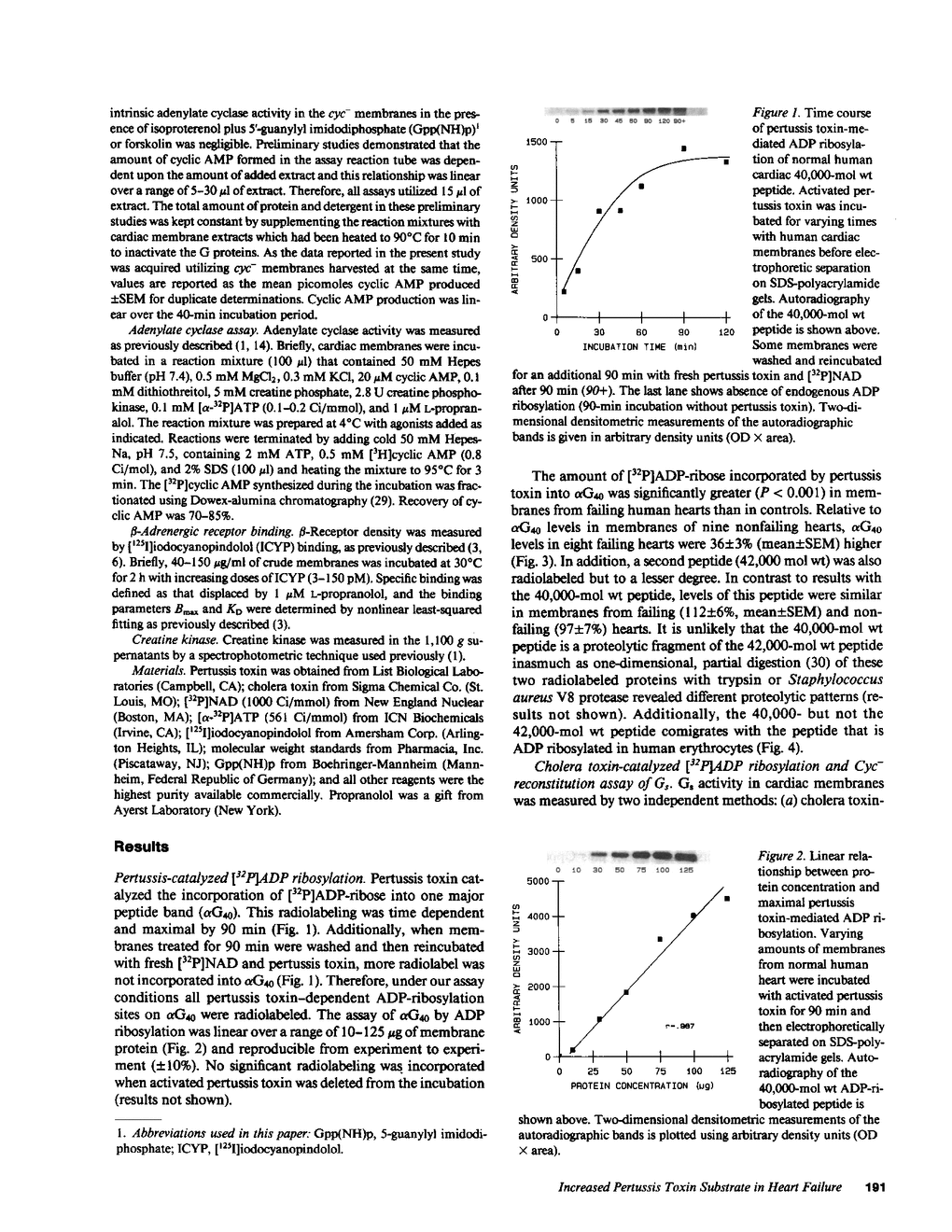 Human heart failure is associated with a diminished contractile response to beta-adrenergic agonists. We hypothesized that alterations in the activity of a guanine nucleotide-binding regulatory protein (G protein) might be partially responsible for this abnormality. We therefore measured the activity of G proteins in failing human myocardium utilizing bacterial toxin-catalyzed ADP ribosylation. The activity of a 40,000-mol wt pertussis toxin substrate (alpha G40) was increased by 36% in failing human hearts when compared with nonfailing controls. In contrast, there was no change in the level of the stimulatory regulatory subunit (Gs). The increased activity in alpha G40 was associated with a 30% decrease in basal as well as 5'-guanylyl imidodiphosphate-stimulated adenylate cyclase activity. These data suggest that increased alpha G40 activity is a new marker for failing myocardium and may account at least in part for the diminished responsiveness to beta 1-adrenergic agonists in the failing human heart.