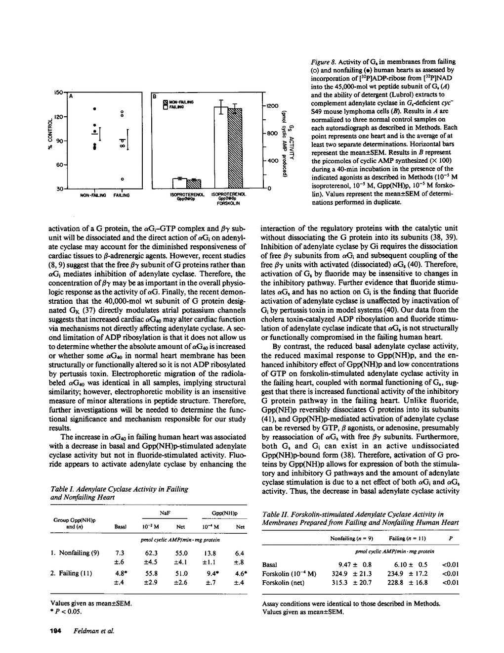 Human heart failure is associated with a diminished contractile response to beta-adrenergic agonists. We hypothesized that alterations in the activity of a guanine nucleotide-binding regulatory protein (G protein) might be partially responsible for this abnormality. We therefore measured the activity of G proteins in failing human myocardium utilizing bacterial toxin-catalyzed ADP ribosylation. The activity of a 40,000-mol wt pertussis toxin substrate (alpha G40) was increased by 36% in failing human hearts when compared with nonfailing controls. In contrast, there was no change in the level of the stimulatory regulatory subunit (Gs). The increased activity in alpha G40 was associated with a 30% decrease in basal as well as 5'-guanylyl imidodiphosphate-stimulated adenylate cyclase activity. These data suggest that increased alpha G40 activity is a new marker for failing myocardium and may account at least in part for the diminished responsiveness to beta 1-adrenergic agonists in the failing human heart.