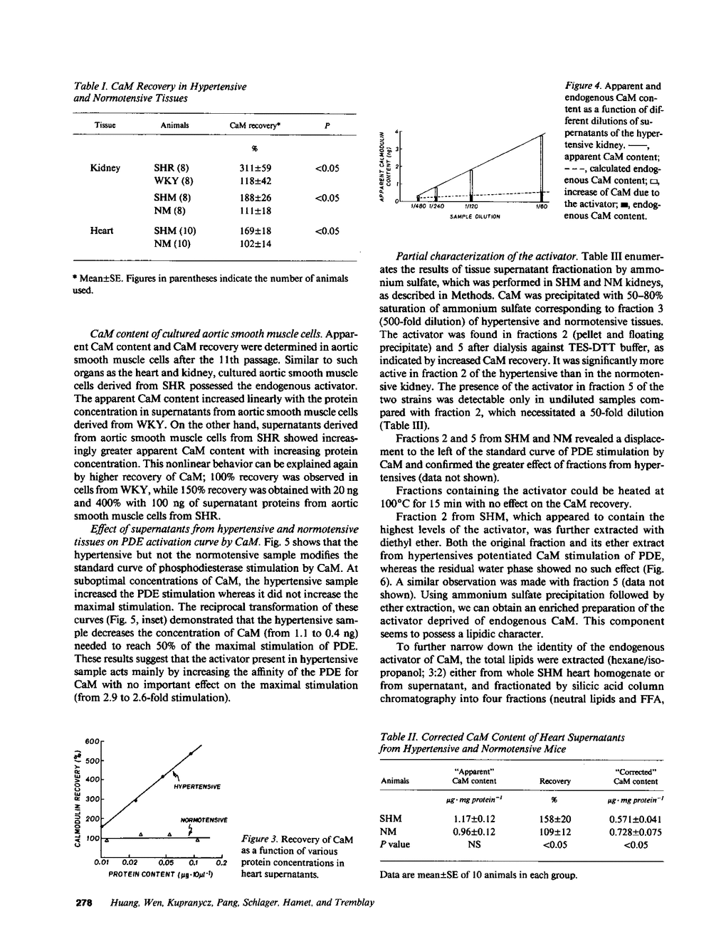 An apparent increase of calmodulin (CaM) activity was previously observed in the heart and kidney but not in the liver of spontaneously-hypertensive rats (SHR) and mice compared with their corresponding normotensive controls. As this change was due to an elevated recovery of CaM in the organs of the hypertensive animals, the present study was designed to evaluate its activity in hypertension. A CaM activator, detected in heart and kidney supernatants from hypertensive animals, was found to be responsible for this enhanced recovery. Similar results were obtained with passaged, cultured aortic smooth muscle cells from SHR, indicating that the anomaly was not a mere consequence of elevated blood pressure but rather a genetic expression of cells of hypertensive origin. The activator was heat stable, nondialyzable, and recovered in the fraction precipitated with 30-50% ammonium sulfate. Preliminary extraction studies suggest that the activator is contained in a glycolipid fraction. The stimulation of phosphodiesterase by this activator was calcium and CaM dependent. The activator appears to affect the affinity of the phosphodiesterase for CaM rather than the maximal stimulation. The activator was also present at a low concentration in the heart and kidney of normotensive animals. These findings indicate that at least some of the calcium abnormalities implicated in the pathogenesis of hypertension could be the result of interactions between CaM, calcium, and this activator.