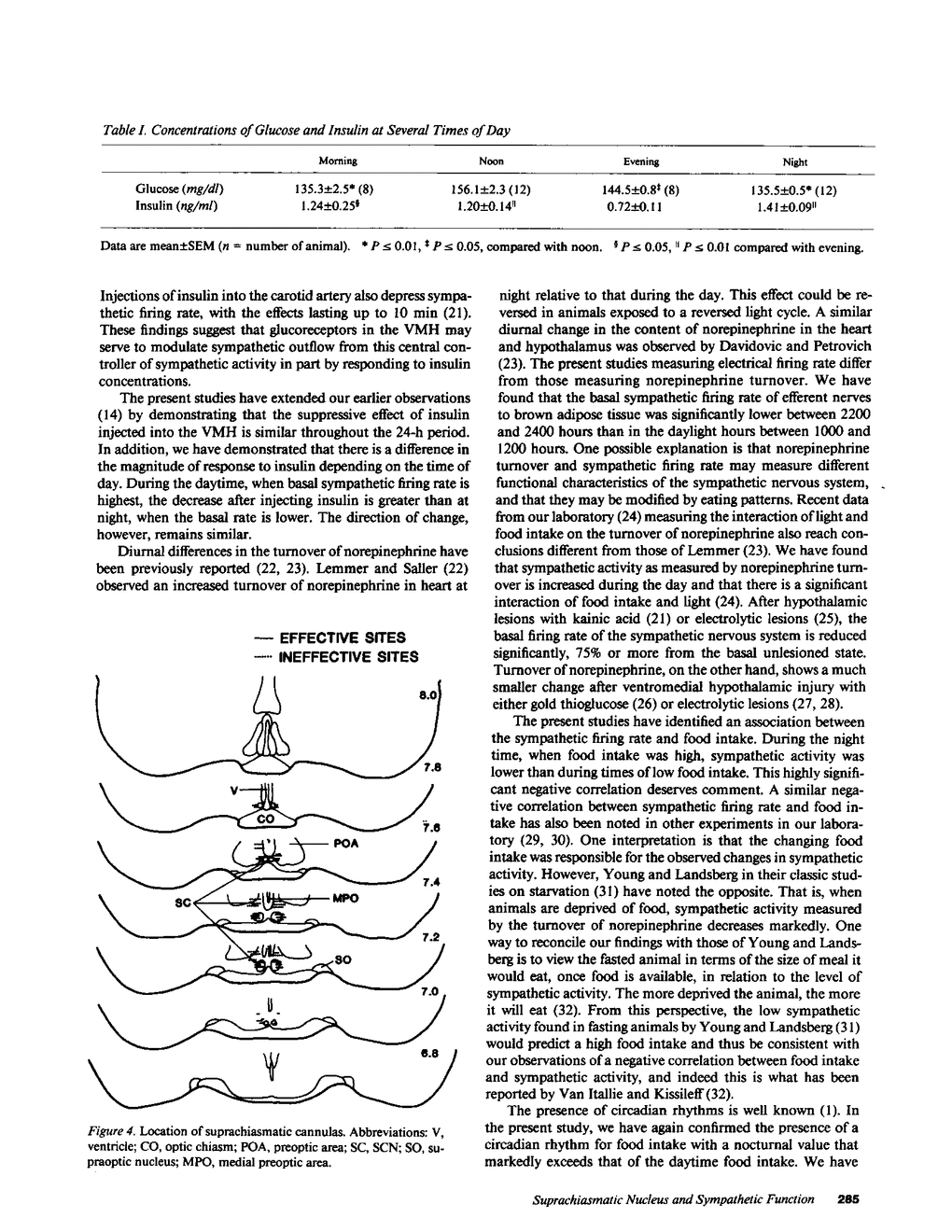 The present study was designed to test whether there are diurnal changes in the firing rate of sympathetic nerves to brown adipose tissue and whether these diurnal rhythms influenced the response to insulin injected into the suprachiasmatic nucleus or ventromedial hypothalamic nucleus (VMH). Food intake was highest at the beginning of the dark period (1800-2200 hours) and lowest during the daylight hours (0600-1000 and 1200-1600 hours). The basal sympathetic firing rate was highest at noon (1000-1200 hours) when food intake was lowest. At midnight, when food intake was highest, sympathetic firing rate was lowest. Injection of insulin (77, 144, and 288 pmol) into the VMH produced a dose-dependent depression of sympathetic firing rate at each of the four measurement periods (0400-0600 hours, 1000-1200 hours, 1600-1800 hours, and 2200-2400 hours), but the magnitude of the effect was greater at noon than at night. In contrast, insulin injections into the suprachiasmatic nucleus decreased the sympathetic firing rate at noon but produced a significant increase in the sympathetic firing rate at night. These data show that a diurnal rhythm exists for the sympathetic firing rate. The decrease in firing rate in response to insulin when injected into the VMH is in the same direction but varies in magnitude throughout the day, whereas the responsiveness of the suprachiasmatic nucleus to injections of insulin shows a reversal of response in relation to day/night cycles. The highly significant inverse relationship between basal sympathetic firing rate and food intake suggests that sympathetic activity may be part of an important control system for energy balance.