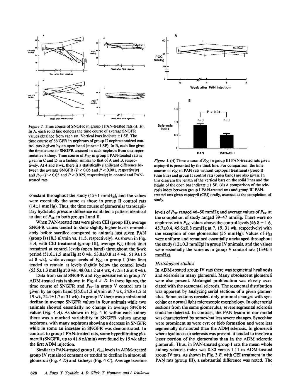 We have recently developed a micropuncture technique to assess repeatedly function of the same nephrons in chronic renal disease and subsequently examine the morphology of their glomeruli by serial thin-section histological analysis. Using this approach, a potential causal linkage between early functional patterns and late structural abnormalities was examined in glomeruli of two established rat models of glomerular sclerosis. The models are (a) puromycin aminonucleoside (PAN) administration in unilaterally nephrectomized Munich-Wistar rats and (b) adriamycin (ADM) treatment in nonnephrectomized Munich-Wistar rats. Single nephron GFR (SNGFR) and glomerular capillary hydraulic pressure (PGC) were measured repeatedly for 8 (PAN rats) or 31 wk (ADM rats). In all animals studied, values for PGC remained at, or slightly below, levels measured before PAN or ADM administration. SNGFR values declined progressively in all glomeruli in PAN rats. Although some glomeruli in ADM rats had an increase in SNGFR above levels observed in nonnephrectomized control rats, these hyperfiltering glomeruli did not have abnormally high PGC nor did they exhibit glomerular sclerosis at the completion of the study. Histological analysis revealed the existence of a significant inverse correlation between the degree of sclerosis and SNGFR assessed at the time of sacrifice in both PAN and ADM groups. Chronic administration of captopril, an angiotensin I converting enzyme inhibitor, in PAN rats substantially attenuated development of glomerular sclerosis without affecting PGC in earlier stages. The observations in these models indicate that glomerular hyperfiltration and hypertension are not required for the development of glomerular sclerosis in renal diseases, and angiotensin I converting enzyme inhibitor can exert its protective effect independently of its effect on glomerular capillary pressure.
