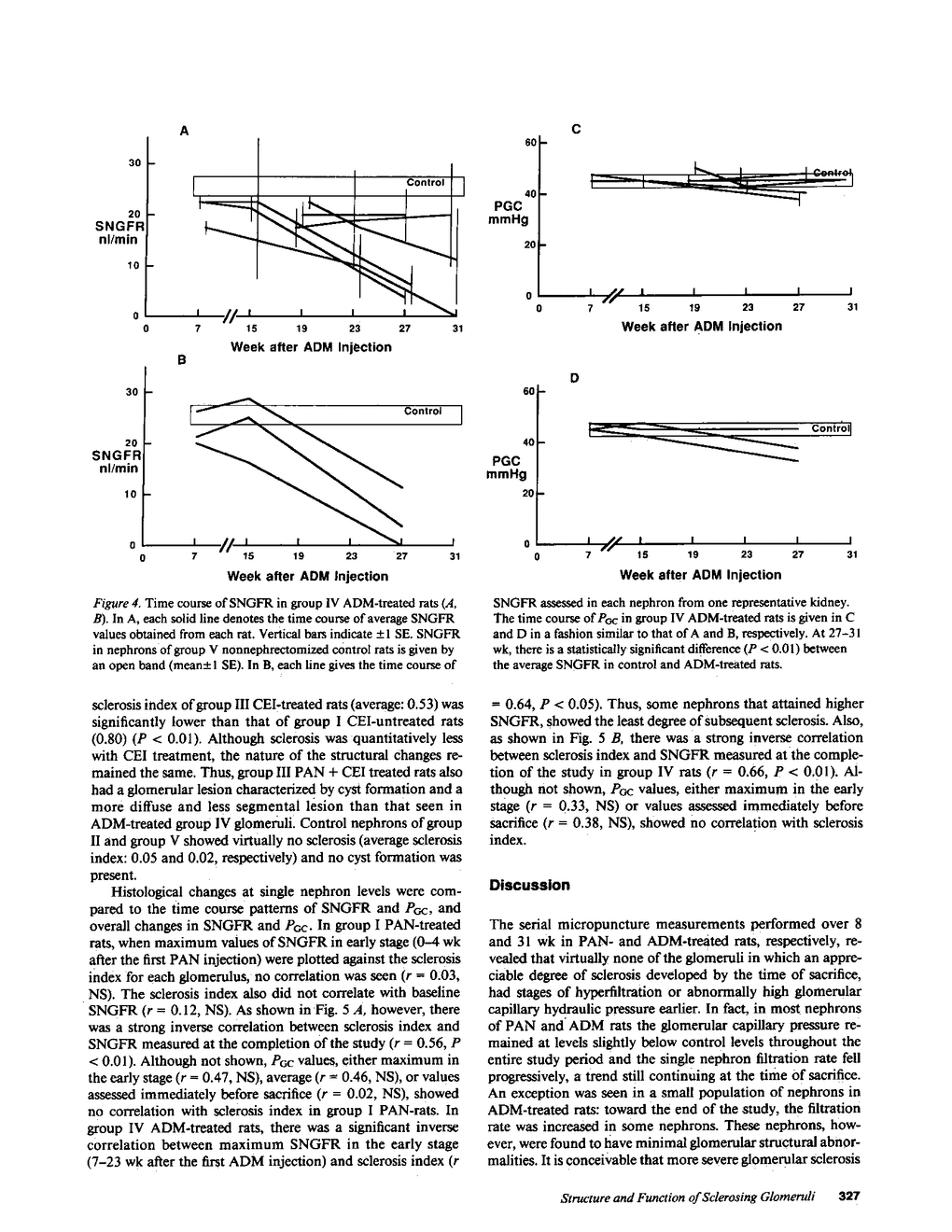 We have recently developed a micropuncture technique to assess repeatedly function of the same nephrons in chronic renal disease and subsequently examine the morphology of their glomeruli by serial thin-section histological analysis. Using this approach, a potential causal linkage between early functional patterns and late structural abnormalities was examined in glomeruli of two established rat models of glomerular sclerosis. The models are (a) puromycin aminonucleoside (PAN) administration in unilaterally nephrectomized Munich-Wistar rats and (b) adriamycin (ADM) treatment in nonnephrectomized Munich-Wistar rats. Single nephron GFR (SNGFR) and glomerular capillary hydraulic pressure (PGC) were measured repeatedly for 8 (PAN rats) or 31 wk (ADM rats). In all animals studied, values for PGC remained at, or slightly below, levels measured before PAN or ADM administration. SNGFR values declined progressively in all glomeruli in PAN rats. Although some glomeruli in ADM rats had an increase in SNGFR above levels observed in nonnephrectomized control rats, these hyperfiltering glomeruli did not have abnormally high PGC nor did they exhibit glomerular sclerosis at the completion of the study. Histological analysis revealed the existence of a significant inverse correlation between the degree of sclerosis and SNGFR assessed at the time of sacrifice in both PAN and ADM groups. Chronic administration of captopril, an angiotensin I converting enzyme inhibitor, in PAN rats substantially attenuated development of glomerular sclerosis without affecting PGC in earlier stages. The observations in these models indicate that glomerular hyperfiltration and hypertension are not required for the development of glomerular sclerosis in renal diseases, and angiotensin I converting enzyme inhibitor can exert its protective effect independently of its effect on glomerular capillary pressure.