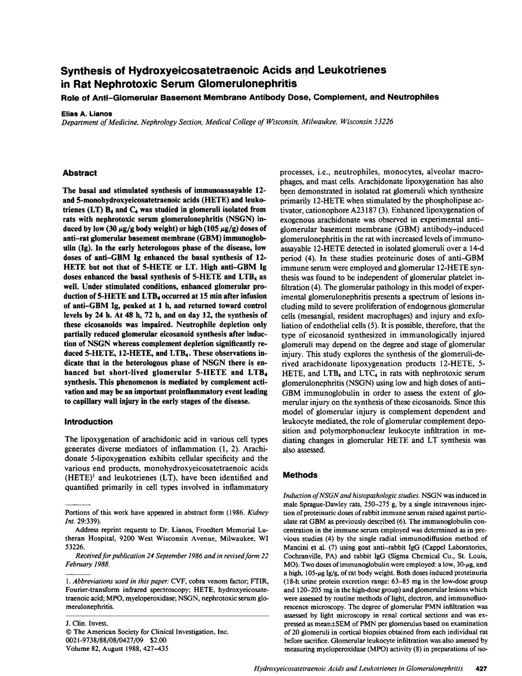 The basal and stimulated synthesis of immunoassayable 12- and 5-monohydroxyeicosatetraenoic acids (HETE) and leukotrienes (LT) B4 and C4 was studied in glomeruli isolated from rats with nephrotoxic serum glomerulonephritis (NSGN) induced by low (30 micrograms/g body weight) or high (105 micrograms/g) doses of anti-rat glomerular basement membrane (GBM) immunoglobulin (Ig). In the early heterologous phase of the disease, low doses of anti-GBM Ig enhanced the basal synthesis of 12-HETE but not that of 5-HETE or LT. High anti-GBM Ig doses enhanced the basal synthesis of 5-HETE and LTB4 as well. Under stimulated conditions, enhanced glomerular production of 5-HETE and LTB4 occurred at 15 min after infusion of anti-GBM Ig, peaked at 1 h, and returned toward control levels by 24 h. At 48 h, 72 h, and on day 12, the synthesis of these eicosanoids was impaired. Neutrophile depletion only partially reduced glomerular eicosanoid synthesis after induction of NSGN whereas complement depletion significantly reduced 5-HETE, 12-HETE, and LTB4. These observations indicate that in the heterologous phase of NSGN there is enhanced but short-lived glomerular 5-HETE and LTB4 synthesis. This phenomenon is mediated by complement activation and may be an important proinflammatory event leading to capillary wall injury in the early stages of the disease.