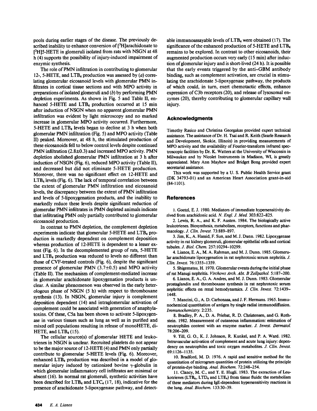 The basal and stimulated synthesis of immunoassayable 12- and 5-monohydroxyeicosatetraenoic acids (HETE) and leukotrienes (LT) B4 and C4 was studied in glomeruli isolated from rats with nephrotoxic serum glomerulonephritis (NSGN) induced by low (30 micrograms/g body weight) or high (105 micrograms/g) doses of anti-rat glomerular basement membrane (GBM) immunoglobulin (Ig). In the early heterologous phase of the disease, low doses of anti-GBM Ig enhanced the basal synthesis of 12-HETE but not that of 5-HETE or LT. High anti-GBM Ig doses enhanced the basal synthesis of 5-HETE and LTB4 as well. Under stimulated conditions, enhanced glomerular production of 5-HETE and LTB4 occurred at 15 min after infusion of anti-GBM Ig, peaked at 1 h, and returned toward control levels by 24 h. At 48 h, 72 h, and on day 12, the synthesis of these eicosanoids was impaired. Neutrophile depletion only partially reduced glomerular eicosanoid synthesis after induction of NSGN whereas complement depletion significantly reduced 5-HETE, 12-HETE, and LTB4. These observations indicate that in the heterologous phase of NSGN there is enhanced but short-lived glomerular 5-HETE and LTB4 synthesis. This phenomenon is mediated by complement activation and may be an important proinflammatory event leading to capillary wall injury in the early stages of the disease.