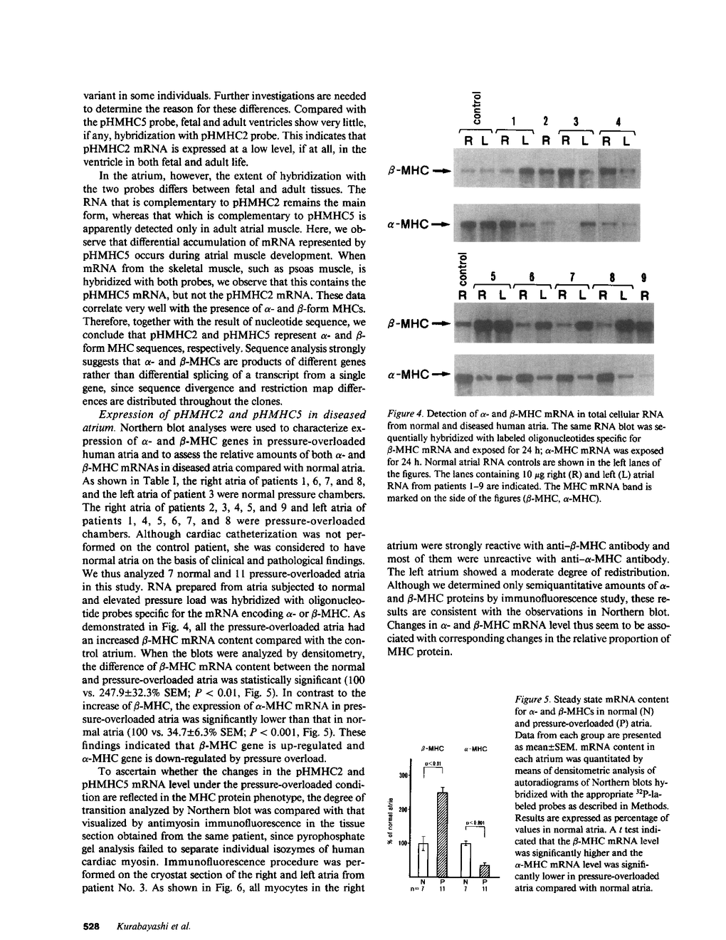 We have constructed and characterized two types of myosin heavy chain (MHC) cDNA clones (pHMHC2, pHMHC5) from a fetal human heart cDNA library. Comparison of the nucleotide and deduced amino acid sequences between pHMHC2 and pHMHC5 shows 95.1 and 96.2% homology, respectively. The carboxyl-terminal peptide and 3'-untranslated (3'-UT) regions are highly divergent and specific for these cDNA clones. By using the synthetic oligonucleotide probes that are complementary to the unique 3'-UT regions of these cDNA clones, we demonstrate that pHMHC2 is exclusively transcribed in the atrium, whereas the mRNA for pHMHC5 is predominantly expressed in the ventricle. This result indicates that pHMHC2 and pHMHC5 code for alpha- and beta-form MHCs, respectively. Furthermore, we show that beta-form MHC mRNA is expressed in adult atrium at a low level but scarcely expressed in fetal atrium. Finally, we demonstrate that MHC isozymic transition in pressure-overloaded atrium is, at least in part, regulated at a pretranslational level.