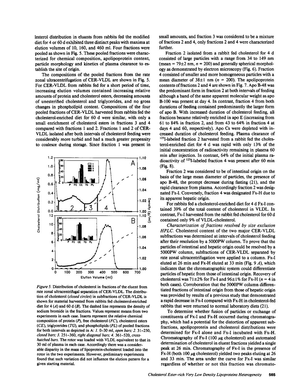 Cholesterol ester-rich (CER) VLDL accumulate rapidly in the plasma of rabbits fed cholesterol-enriched diets. However, the major loci of enhanced synthesis of subfractions of CER-VLDL, their interaction with macrophages, and their relative contribution to atherogenesis have not yet been elucidated. To determine whether anabolism is hepatic or intestinal, subfractions of CER-VLDL were characterized at selected intervals from day 0 to 60 of cholesterol feeding. Rate zonal ultracentrifugation of CER-VLDL from rabbits fed cholesterol for 4 and 60 d demonstrated an early increase of the proportion of cholesterol carried in the intestinally-derived fraction (designated as Fx-I) of VLDL compared with that in hepatically-derived particles (Fx-H). Quantification by size exclusion HPLC also demonstrated that Fx-I was a prominent CER-VLDL component at day 4, while Fx-H particles became increasingly prominent with further cholesterol feeding. At both 4 and 60 d Fx-I stimulated cholesterol esterification and intracellular cholesterol content in macrophages more than the corresponding Fx-H did. In fact, Fx-H harvested at 4 d produced no cholesterol ester deposition. In contrast, Fx-H harvested at 60 d markedly stimulated cholesterol esterification and intracellular cholesterol content. Thus, both compositional and metabolic characteristics of CER-VLDL changed as a function of the duration cholesterol feeding.