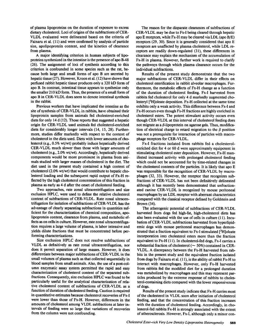 Cholesterol ester-rich (CER) VLDL accumulate rapidly in the plasma of rabbits fed cholesterol-enriched diets. However, the major loci of enhanced synthesis of subfractions of CER-VLDL, their interaction with macrophages, and their relative contribution to atherogenesis have not yet been elucidated. To determine whether anabolism is hepatic or intestinal, subfractions of CER-VLDL were characterized at selected intervals from day 0 to 60 of cholesterol feeding. Rate zonal ultracentrifugation of CER-VLDL from rabbits fed cholesterol for 4 and 60 d demonstrated an early increase of the proportion of cholesterol carried in the intestinally-derived fraction (designated as Fx-I) of VLDL compared with that in hepatically-derived particles (Fx-H). Quantification by size exclusion HPLC also demonstrated that Fx-I was a prominent CER-VLDL component at day 4, while Fx-H particles became increasingly prominent with further cholesterol feeding. At both 4 and 60 d Fx-I stimulated cholesterol esterification and intracellular cholesterol content in macrophages more than the corresponding Fx-H did. In fact, Fx-H harvested at 4 d produced no cholesterol ester deposition. In contrast, Fx-H harvested at 60 d markedly stimulated cholesterol esterification and intracellular cholesterol content. Thus, both compositional and metabolic characteristics of CER-VLDL changed as a function of the duration cholesterol feeding.