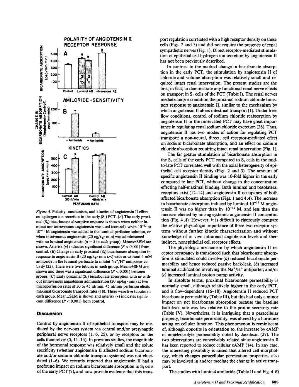 Physiologic concentrations of angiotensin II stimulate sodium transport by intestinal and renal early (S1) and late (S2) proximal tubule epithelial cells. We recently found that hydrogen ion secretion, which effects sodium bicarbonate absorption, was a transport function preferentially and potently increased by angiotensin II in S1 cells. S1 cells are normally responsible for half of the total renal hydrogen ion secretion. The mechanism by which angiotensin II regulates intestinal sodium transport is by potentiating sympathetic nerve activity and norepinephrine release. Direct control of hydrogen ion secretion by angiotensin II via receptors on epithelial cells has not been previously demonstrated. We now report that stimulation of in vivo hydrogen ion secretion in the rat early proximal tubule by angiotensin II was not mediated via change in nerve activity. Rather, enhanced hydrogen ion secretion by angiotensin II correlated with increased angiotensin II receptor density on epithelial cells in the early compared to late microdissected proximal tubule. Basolateral as well as luminal angiotensin II stimulated bicarbonate absorption. Angiotensin II reduced bicarbonate permeability and caused alteration in the apparent substrate affinity, but not maximal capacity, of the proximal hydrogen ion secretory system involving the Na+/H+ antiporter.