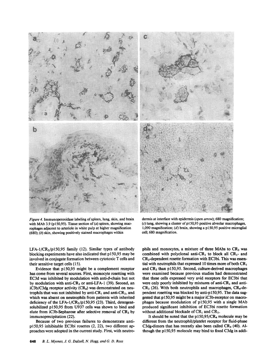 Previous investigations of p150,95 (CD11c), the third member of the CD18 membrane glycoprotein family that includes CR3 (Mac-1 or CD11b) and LFA-1 (CD11a), had demonstrated that solubilized p150,95 bound to iC3b-agarose in a manner similar to isolated CR3. The current study showed that membrane surface p150,95 also expressed iC3b-receptor activity and was probably the same as the neutrophil receptor for iC3b- or C3dg-coated erythrocytes (EC3bi or EC3dg) that had been previously designated CR4. Normal neutrophil and macrophage CR4-dependent EC3bi rosettes were inhibited by monoclonal anti-p150,95, and cells from a patient with CD18 deficiency did not form CR4-dependent EC3bi rosettes. With neutrophils that bore large amounts of CR1 and CR3 and little p150,95, EC3bi were found primarily via CR1 and CR3, and demonstration of p150,95-dependent rosettes required large amounts of fixed iC3b, low-ionic strength buffer, and antibody blockade of CR1 and CR3. By contrast, culture-derived macrophages expressed eight times more p150,95 than did monocytes and EC3bi were bound to both p150,95 and CR3 when EC3bi bore small amounts of fixed iC3b and assays were carried out in isotonic buffer. Comparison of the amounts of CR1, CR3, and CR4 in various tissues by immunoperoxidase staining revealed that CR4 was the most abundant C3 receptor molecule on tissue macrophages, and suggested that CR4 might be involved in clearance of C3-opsonized particles or immune complexes.