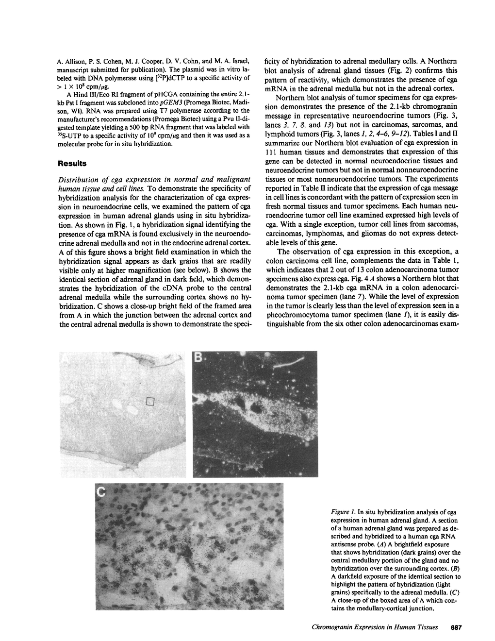 We used a recombinant cDNA probe for human chromogranin A to measure the expression of mRNA encoded by this gene in a variety of normal human tissues and tumor specimens using Northern blot and in situ hybridization analysis. With few exceptions, the expression of chromogranin A mRNA appears to be restricted to normal tissues and tumors of neuroendocrine lineage. However, we have detected mRNA expression of this gene in 1 of 14 cell lines and 2 of 13 tumor specimens of colon adenocarcinoma. The finding of chromogranin A expression in some colon carcinomas suggests that a previously unrecognized subgroup of these tumors has neuroendocrine features. The detection of this subgroup demonstrates the potential for improving tumor classification through the use of techniques and reagents developed by recombinant DNA technology.
