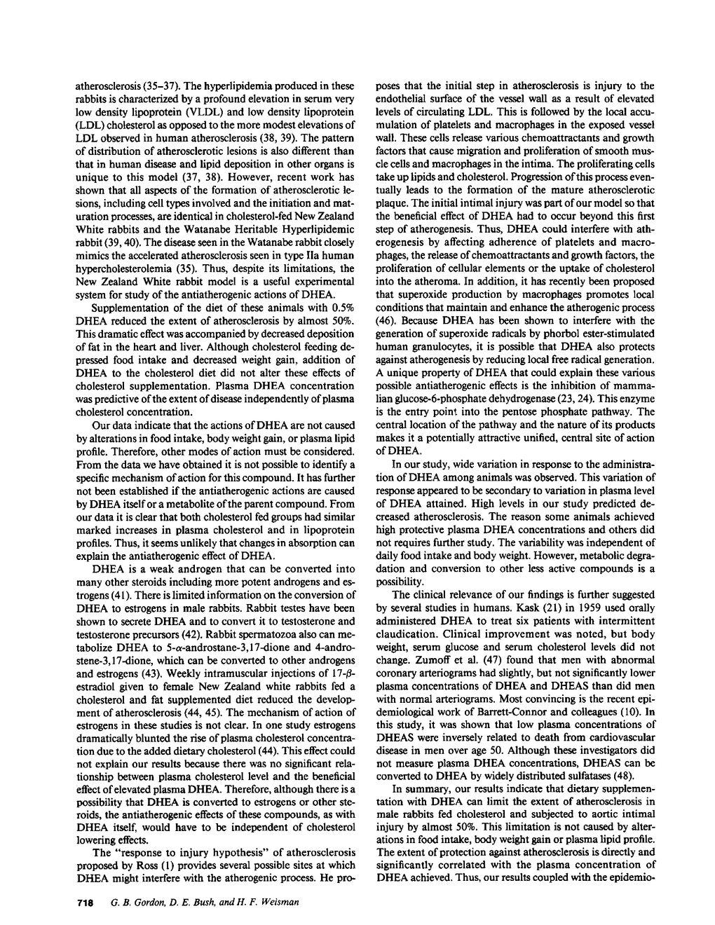 Dehydroepiandrosterone (DHEA) is an endogenous steroid that blocks carcinogenesis, retards aging, and exerts antiproliferative properties. In vitro, it is a potent inhibitor of glucose-6-phosphate dehydrogenase, the first committed step of the pentose phosphate pathway. In man, serum levels of DHEA and its sulfate peak in early adulthood and drop markedly with age. Epidemiologic evidence indicates that low levels of DHEA or its sulfate conjugate are linked to an increased risk of developing cancer or of death from cardiovascular disease. Like cancer, atherosclerosis is a proliferative process characterized by both initiation and promotion phases. This similarity provided a framework in which to study the antiatherogenic effects of DHEA. Rabbits were randomly assigned to four groups. Two groups of rabbits received aortic endothelial injury by balloon catheter and were fed a 2% cholesterol diet for 12 wk. DHEA, 0.5%, was incorporated into the diet of one group receiving the 2% cholesterol diet and endothelial injury and also into the diet of one of the control groups. Animals were killed after 12 wk and aortas, hearts, and livers were studied. Plasma samples were analyzed for total cholesterol, VLDL, LDL, HDL, triglycerides, DHEA, and DHEA-sulfate levels. The atherogenic insult resulted in severe atherosclerosis in animals not treated with DHEA. In those receiving DHEA there was an almost 50% reduction in plaque size (P = 0.006), inversely related to the serum level of DHEA attained. Fatty infiltration of the heart and liver were also markedly reduced. These beneficial actions were not attributable to differences in body weight gain, food intake, total plasma cholesterol or distribution of cholesterol among the VLDL, LDL, or HDL fractions. The results show that high levels of plasma DHEA inhibit the development of atherosclerosis and they provide an important experimental link to the epidemiologic studies correlating low DHEA-sulfate plasma levels with an enhanced risk of cardiovascular mortality.