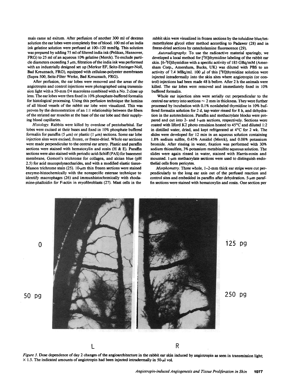 Angiotropin is a differentiation factor for microvascular endothelial cells isolated from serum-free cultures of lectin-activated, porcine monocytes. We used an ear lobe model in rabbits, single intradermal injection of angiotropin to induce phenotypical changes of the endothelial cells in capillaries and postcapillary venules, vascular engorgement, and subsequent angiogenesis in dose-dependent manner. The vascular changes are associated with epidermal and stromal cell proliferation. Angiogenesis and tissue proliferation occur in the absence of tissue necrosis and do not lead to scar formation. Angiotropin-induced angiogenesis is not inhibited by local dexamethasone although it involves a defined turnover of inflammatory cells. Proliferation is transient and regressive events follow. The overall tissue reaction resembles changes found in the undamaged skin margin of a primary healing wound during the inflammatory/proliferative phase. From these observations we conclude that angiotropin is an important secretory product of activated peripheral macrophages that triggers inflammatory and proliferative reactions in wound healing by activating microvascular endothelial cells.