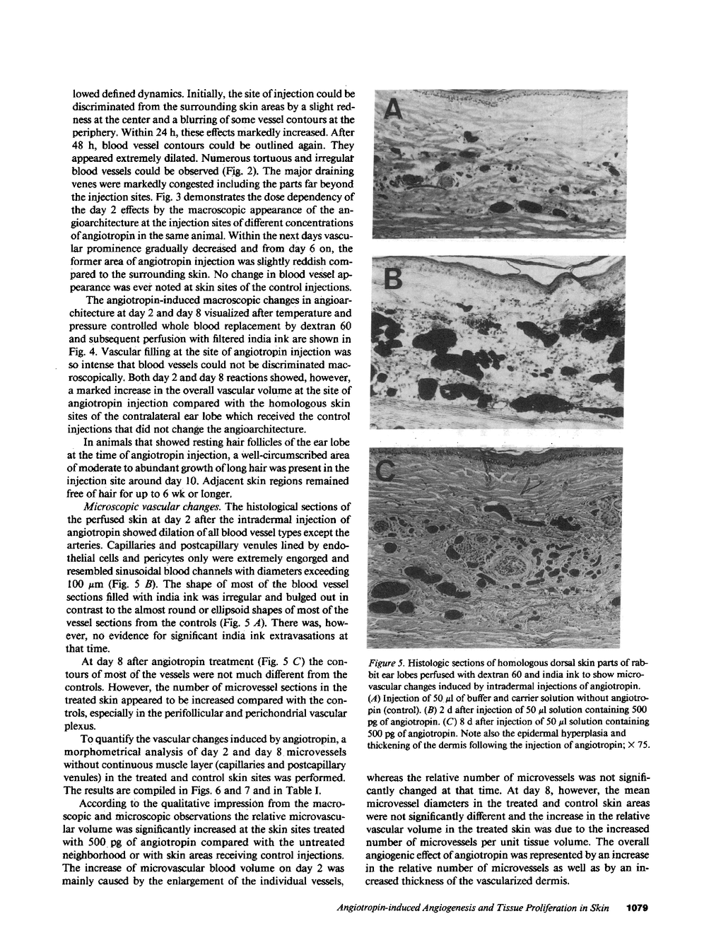Angiotropin is a differentiation factor for microvascular endothelial cells isolated from serum-free cultures of lectin-activated, porcine monocytes. We used an ear lobe model in rabbits, single intradermal injection of angiotropin to induce phenotypical changes of the endothelial cells in capillaries and postcapillary venules, vascular engorgement, and subsequent angiogenesis in dose-dependent manner. The vascular changes are associated with epidermal and stromal cell proliferation. Angiogenesis and tissue proliferation occur in the absence of tissue necrosis and do not lead to scar formation. Angiotropin-induced angiogenesis is not inhibited by local dexamethasone although it involves a defined turnover of inflammatory cells. Proliferation is transient and regressive events follow. The overall tissue reaction resembles changes found in the undamaged skin margin of a primary healing wound during the inflammatory/proliferative phase. From these observations we conclude that angiotropin is an important secretory product of activated peripheral macrophages that triggers inflammatory and proliferative reactions in wound healing by activating microvascular endothelial cells.