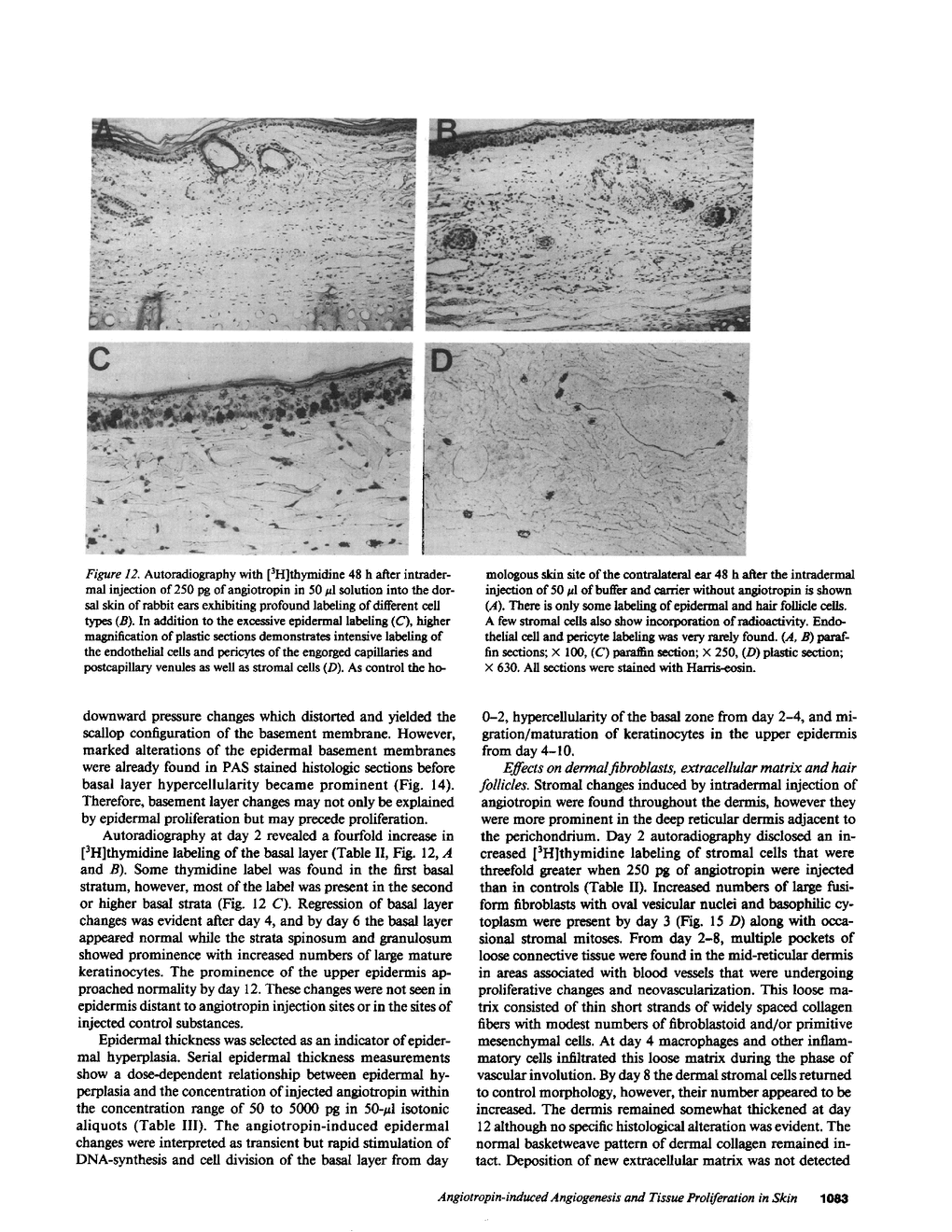 Angiotropin is a differentiation factor for microvascular endothelial cells isolated from serum-free cultures of lectin-activated, porcine monocytes. We used an ear lobe model in rabbits, single intradermal injection of angiotropin to induce phenotypical changes of the endothelial cells in capillaries and postcapillary venules, vascular engorgement, and subsequent angiogenesis in dose-dependent manner. The vascular changes are associated with epidermal and stromal cell proliferation. Angiogenesis and tissue proliferation occur in the absence of tissue necrosis and do not lead to scar formation. Angiotropin-induced angiogenesis is not inhibited by local dexamethasone although it involves a defined turnover of inflammatory cells. Proliferation is transient and regressive events follow. The overall tissue reaction resembles changes found in the undamaged skin margin of a primary healing wound during the inflammatory/proliferative phase. From these observations we conclude that angiotropin is an important secretory product of activated peripheral macrophages that triggers inflammatory and proliferative reactions in wound healing by activating microvascular endothelial cells.