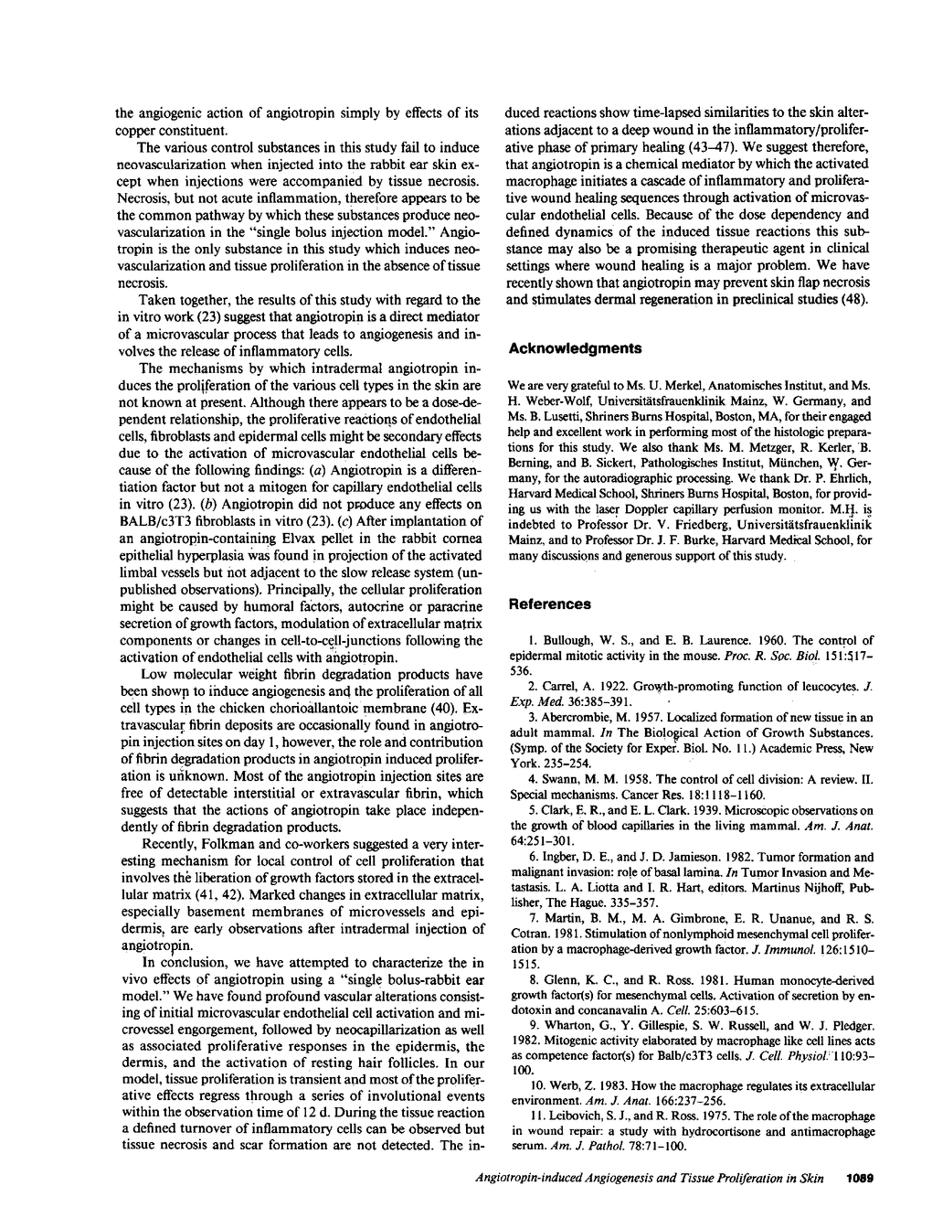 Angiotropin is a differentiation factor for microvascular endothelial cells isolated from serum-free cultures of lectin-activated, porcine monocytes. We used an ear lobe model in rabbits, single intradermal injection of angiotropin to induce phenotypical changes of the endothelial cells in capillaries and postcapillary venules, vascular engorgement, and subsequent angiogenesis in dose-dependent manner. The vascular changes are associated with epidermal and stromal cell proliferation. Angiogenesis and tissue proliferation occur in the absence of tissue necrosis and do not lead to scar formation. Angiotropin-induced angiogenesis is not inhibited by local dexamethasone although it involves a defined turnover of inflammatory cells. Proliferation is transient and regressive events follow. The overall tissue reaction resembles changes found in the undamaged skin margin of a primary healing wound during the inflammatory/proliferative phase. From these observations we conclude that angiotropin is an important secretory product of activated peripheral macrophages that triggers inflammatory and proliferative reactions in wound healing by activating microvascular endothelial cells.