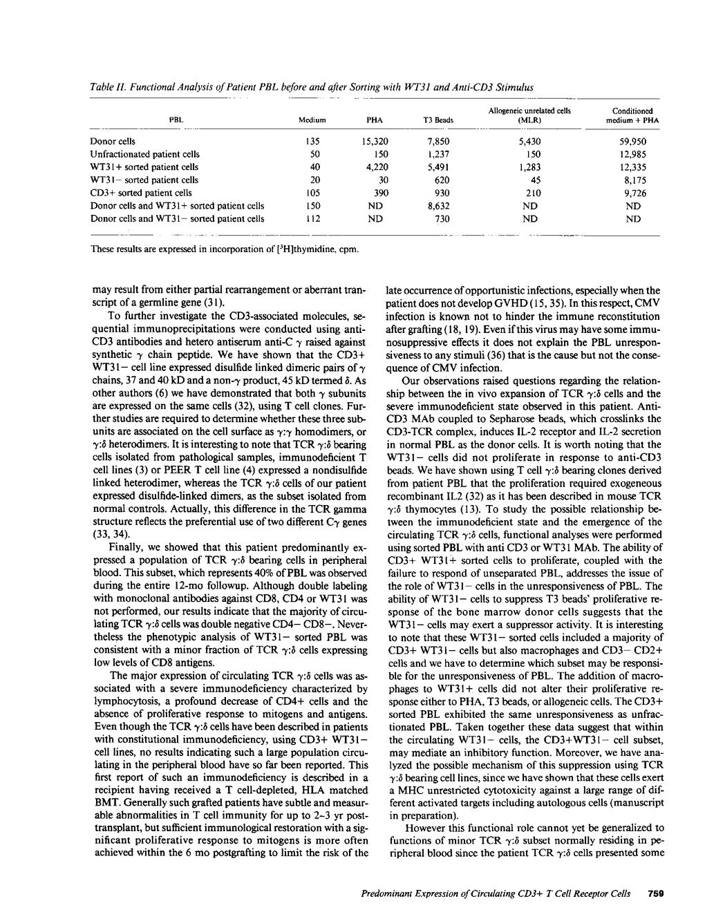 The cell surface expression of alpha:beta heterodimer was studied using WT31 monoclonal antibody, in peripheral blood lymphocytes (PBL) from a patient who developed a prolonged immunodeficiency after allogeneic bone marrow transplantation. This patient, grafted for chronic myelogenous leukemia, received T cell depleted bone marrow from her HLA, A, B, D matched sibling. The late occurrence of opportunistic infection, led us to analyze the phenotype of patient PBL. 70% of PBL were CD3+ and 29% WT31+, indicating that the majority of CD3+ PBL did not express the alpha:beta heterodimer. Transcription of the genes encoding the alpha, beta, and gamma chains was assessed in cell lines derived from PBL, by Northern blot analysis. We showed that the CD3+ WT31- subset expressed a truncated, beta mRNA (1.0 kb) and also truncated alpha transcript (1.4 kb). To determine the CD3-associated structure on CD3+ WT31- cell line, immunoprecipitation assays were performed using monoclonal anti-CD3 and an hetero antiserum against gamma peptides. These CD3+ WT31- cells expressed a disulfide linked dimer, composed of products of gamma gene (37 kD, 40 kD) and of undefined delta chain (45 kD). Functional analyses were performed in PBL before and after sorting with WT31 and anti-CD3 antibody. These circulating CD3+ WT31- cells were unable to proliferate when triggered with anti-T3 beads and they seemed to mediate a suppressor activity on CD3+ WT31+ cells.