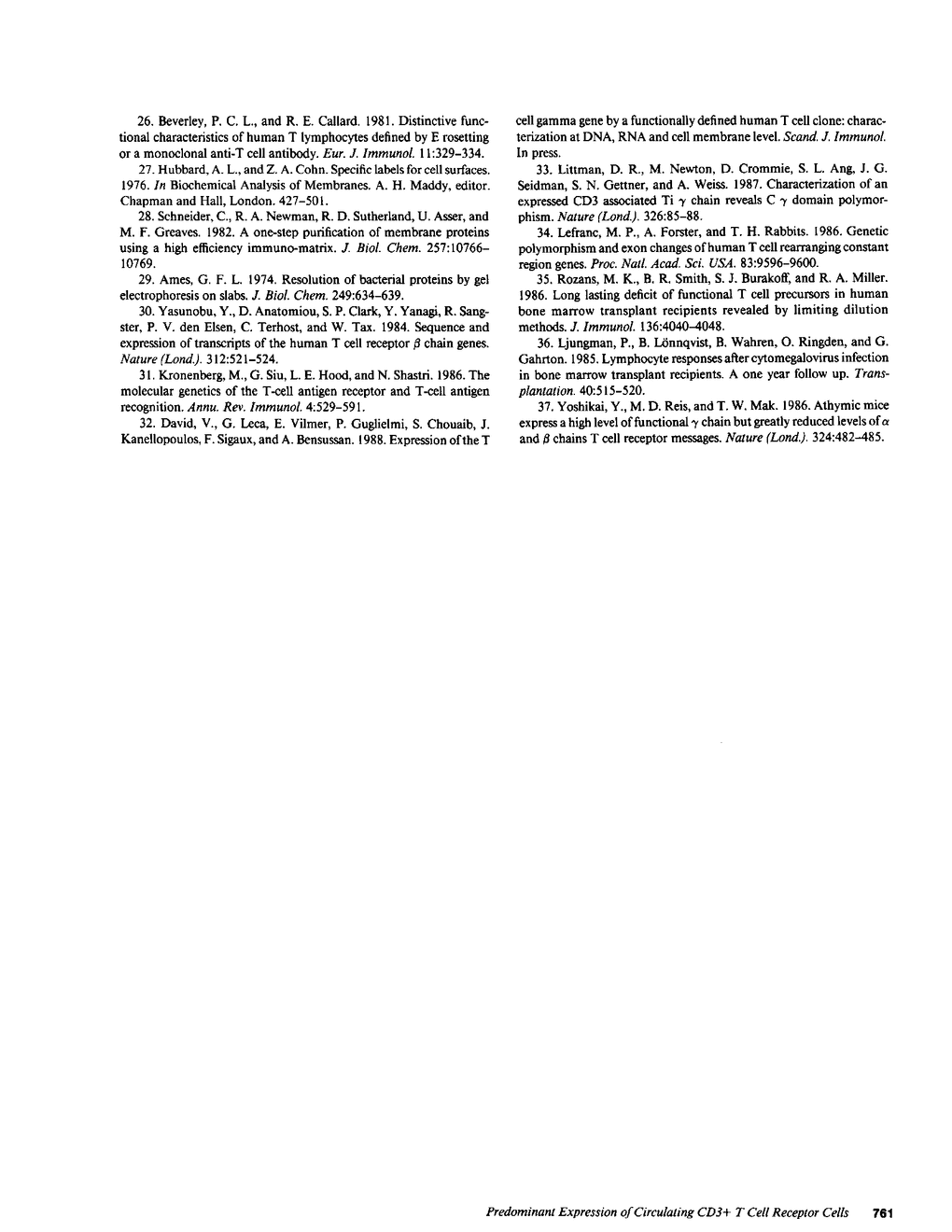 The cell surface expression of alpha:beta heterodimer was studied using WT31 monoclonal antibody, in peripheral blood lymphocytes (PBL) from a patient who developed a prolonged immunodeficiency after allogeneic bone marrow transplantation. This patient, grafted for chronic myelogenous leukemia, received T cell depleted bone marrow from her HLA, A, B, D matched sibling. The late occurrence of opportunistic infection, led us to analyze the phenotype of patient PBL. 70% of PBL were CD3+ and 29% WT31+, indicating that the majority of CD3+ PBL did not express the alpha:beta heterodimer. Transcription of the genes encoding the alpha, beta, and gamma chains was assessed in cell lines derived from PBL, by Northern blot analysis. We showed that the CD3+ WT31- subset expressed a truncated, beta mRNA (1.0 kb) and also truncated alpha transcript (1.4 kb). To determine the CD3-associated structure on CD3+ WT31- cell line, immunoprecipitation assays were performed using monoclonal anti-CD3 and an hetero antiserum against gamma peptides. These CD3+ WT31- cells expressed a disulfide linked dimer, composed of products of gamma gene (37 kD, 40 kD) and of undefined delta chain (45 kD). Functional analyses were performed in PBL before and after sorting with WT31 and anti-CD3 antibody. These circulating CD3+ WT31- cells were unable to proliferate when triggered with anti-T3 beads and they seemed to mediate a suppressor activity on CD3+ WT31+ cells.