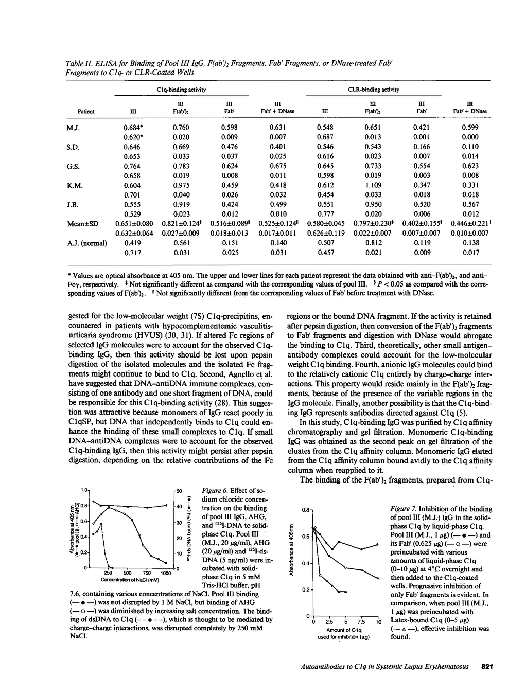 The majority of C1q-binding IgG in sera of some patients with systemic lupus erythematosus (SLE) cosediments with monomeric IgG. This study was undertaken to provide definitive proof that the low-molecular weight C1q-binding IgG consists of autoantibodies to C1q. Monomeric C1q-binding IgG was isolated from five SLE plasmas by C1q affinity chromatography and gel filtration. All C1q-binding IgG preparations and their F(ab')2 fragments bound to both C1q and the collagen-like region of C1q by an ELISA. To rule out the possibility that small DNA-antiDNA immune complexes caused this binding activity, Fab' fragments of the C1q-binding IgG preparations were digested with DNase I to degrade any DNA. The Fab' fragments continued to bind to C1q and its collagen-like region after this treatment. C1q-binding IgG was heterogenous on isoelectric focusing. Interaction of C1q-binding IgG with solid-phase C1q was retained in 1 M NaCl, whereas the binding of DNA or heat-aggregated IgG to solid-phase C1q was abrogated or markedly diminished. The association constant of C1q-binding IgG with solid-phase C1q was 2.7 X 10(7) M-1. We conclude that low-molecular weight C1q-binding IgG in the studied patients with SLE consists of autoantibodies to the collagen-like region of C1q.
