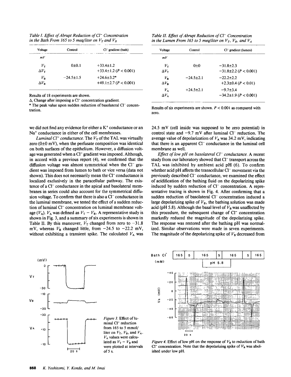 To examine whether Cl- is transported via transcellular pathways in the thin ascending limb of Henle's loop (TAL), conventional microelectrode technique was applied in isolated TAL segments of hamsters perfused in vitro. The average basolateral membrane voltage (VB) was -24.5 +/- 1.5 mV (n = 18). Ouabain (10(-4) M) had no effect on VB. Sudden reduction of basolateral Cl- concentration from 165 to 5 mmol/liter caused a large depolarizing spike (+49.1 +/- 2.7 mV, n = 18), while the transepithelial potential (VT) showed lumen positive deflection by 33.4 +/- 1.2 mV, which indicates that a large Cl- conductance exists in the basolateral membrane. Reduction of luminal Cl- concentration caused sustained depolarization of luminal cell membrane from +24.5 +/- 2.1 to -9.7 +/- 3.4 mV (n = 6), which indicates that there is also a Cl- conductance in the luminal membrane. Since we have previously shown that acidification of ambient solution suppresses the transmural Cl- permeability, we tested whether acid pH also inhibits the Cl- conductance of the basolateral membrane. When pH of the bathing fluid was lowered to 5.8, the depolarizing spike of VB and the change of VT upon sudden reduction of basolateral Cl- were almost completely abolished. From these results we conclude: (a) both the luminal and the basolateral membrane of hamster TAL segments have Cl- conductances, and (b) Cl- transport in the TAL takes place, at least in part, via a transcellular route when a transepithelial Cl- gradient is present.