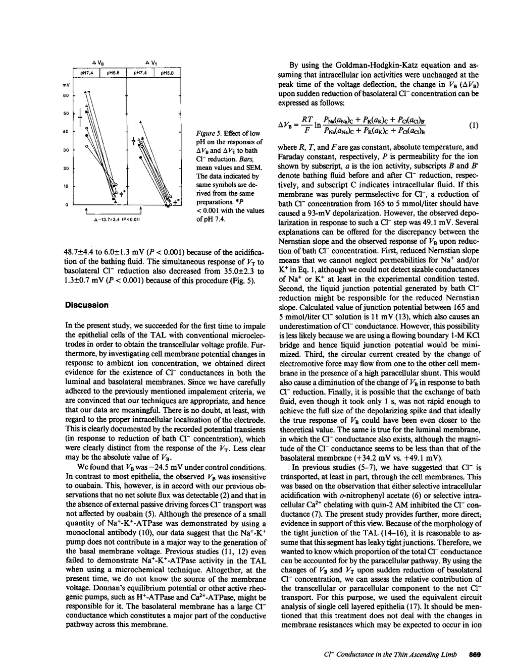To examine whether Cl- is transported via transcellular pathways in the thin ascending limb of Henle's loop (TAL), conventional microelectrode technique was applied in isolated TAL segments of hamsters perfused in vitro. The average basolateral membrane voltage (VB) was -24.5 +/- 1.5 mV (n = 18). Ouabain (10(-4) M) had no effect on VB. Sudden reduction of basolateral Cl- concentration from 165 to 5 mmol/liter caused a large depolarizing spike (+49.1 +/- 2.7 mV, n = 18), while the transepithelial potential (VT) showed lumen positive deflection by 33.4 +/- 1.2 mV, which indicates that a large Cl- conductance exists in the basolateral membrane. Reduction of luminal Cl- concentration caused sustained depolarization of luminal cell membrane from +24.5 +/- 2.1 to -9.7 +/- 3.4 mV (n = 6), which indicates that there is also a Cl- conductance in the luminal membrane. Since we have previously shown that acidification of ambient solution suppresses the transmural Cl- permeability, we tested whether acid pH also inhibits the Cl- conductance of the basolateral membrane. When pH of the bathing fluid was lowered to 5.8, the depolarizing spike of VB and the change of VT upon sudden reduction of basolateral Cl- were almost completely abolished. From these results we conclude: (a) both the luminal and the basolateral membrane of hamster TAL segments have Cl- conductances, and (b) Cl- transport in the TAL takes place, at least in part, via a transcellular route when a transepithelial Cl- gradient is present.
