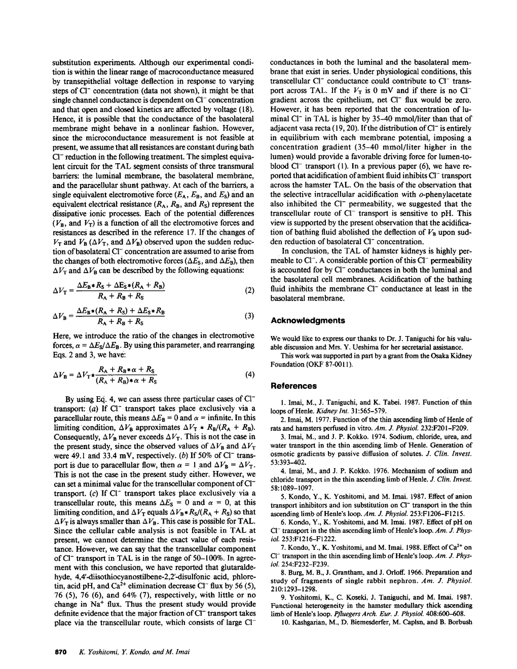 To examine whether Cl- is transported via transcellular pathways in the thin ascending limb of Henle's loop (TAL), conventional microelectrode technique was applied in isolated TAL segments of hamsters perfused in vitro. The average basolateral membrane voltage (VB) was -24.5 +/- 1.5 mV (n = 18). Ouabain (10(-4) M) had no effect on VB. Sudden reduction of basolateral Cl- concentration from 165 to 5 mmol/liter caused a large depolarizing spike (+49.1 +/- 2.7 mV, n = 18), while the transepithelial potential (VT) showed lumen positive deflection by 33.4 +/- 1.2 mV, which indicates that a large Cl- conductance exists in the basolateral membrane. Reduction of luminal Cl- concentration caused sustained depolarization of luminal cell membrane from +24.5 +/- 2.1 to -9.7 +/- 3.4 mV (n = 6), which indicates that there is also a Cl- conductance in the luminal membrane. Since we have previously shown that acidification of ambient solution suppresses the transmural Cl- permeability, we tested whether acid pH also inhibits the Cl- conductance of the basolateral membrane. When pH of the bathing fluid was lowered to 5.8, the depolarizing spike of VB and the change of VT upon sudden reduction of basolateral Cl- were almost completely abolished. From these results we conclude: (a) both the luminal and the basolateral membrane of hamster TAL segments have Cl- conductances, and (b) Cl- transport in the TAL takes place, at least in part, via a transcellular route when a transepithelial Cl- gradient is present.